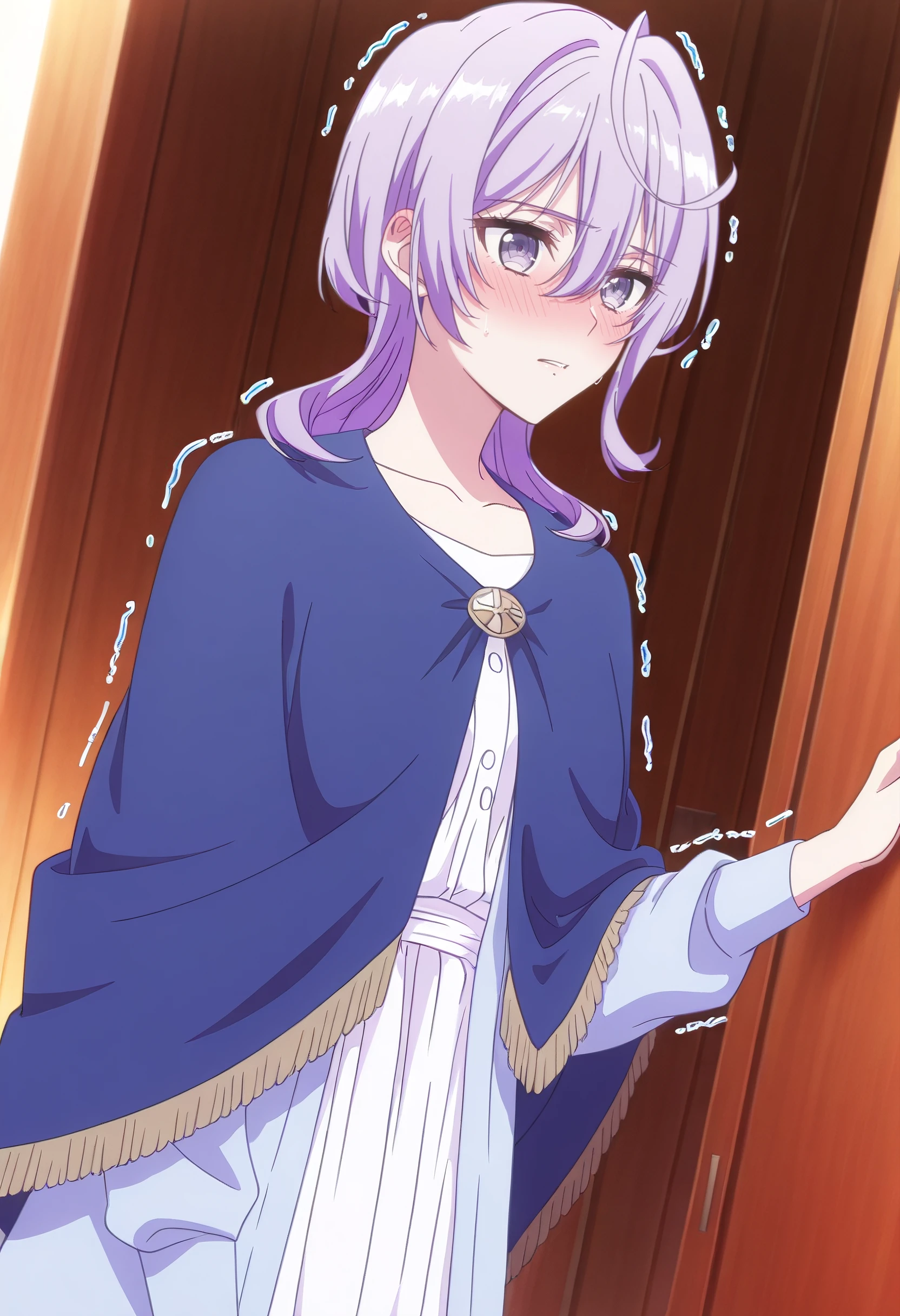 PhiliaHoodie, hood, hood down, short hair, long sleeves, white hood, white hoodie, hoodie, cloak, white cloak, hooded cloak, wide sleeves, dress, white cape, frills, frilled dress, long dress, white coat, drawstring, sleeves past wrists, purple dress,