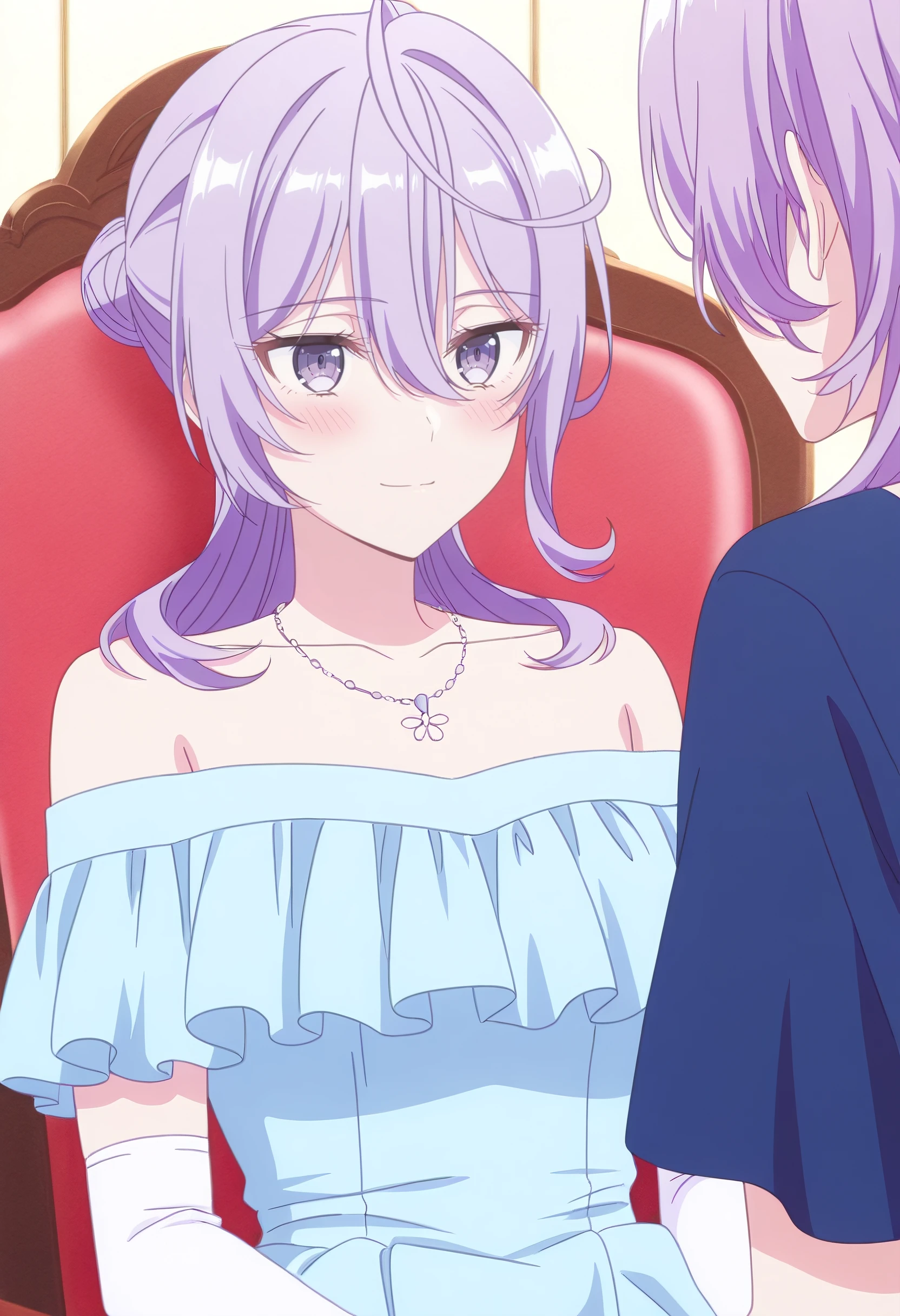 PhiliaFrDress, hair bun, short sleeves, dress, blue dress, jewelry, single side bun, collarbone, frills, necklace, elbow gloves, white gloves, gloves, single hair bun, shirt, blue shirt, off-shoulder dress,