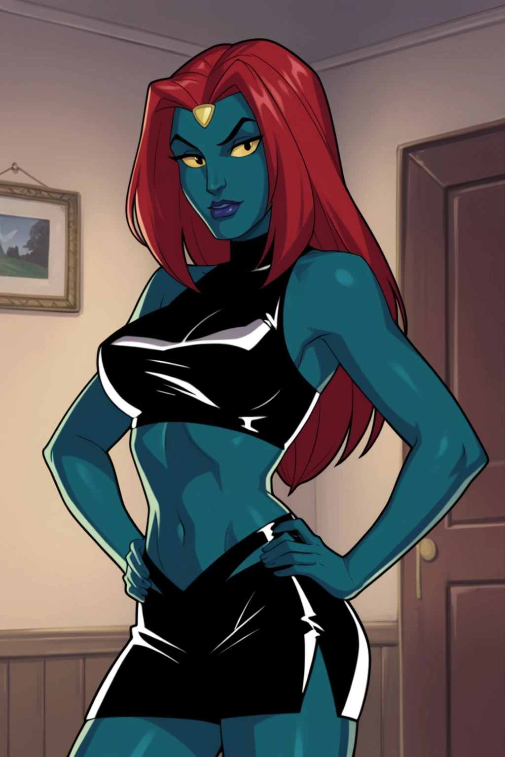 Base Prompt: raven darkholme, forehead jewel, long hair, red hair, colored skin, green skin, blue skin, black pupils, yellow eyes, colored sclera, lipstick