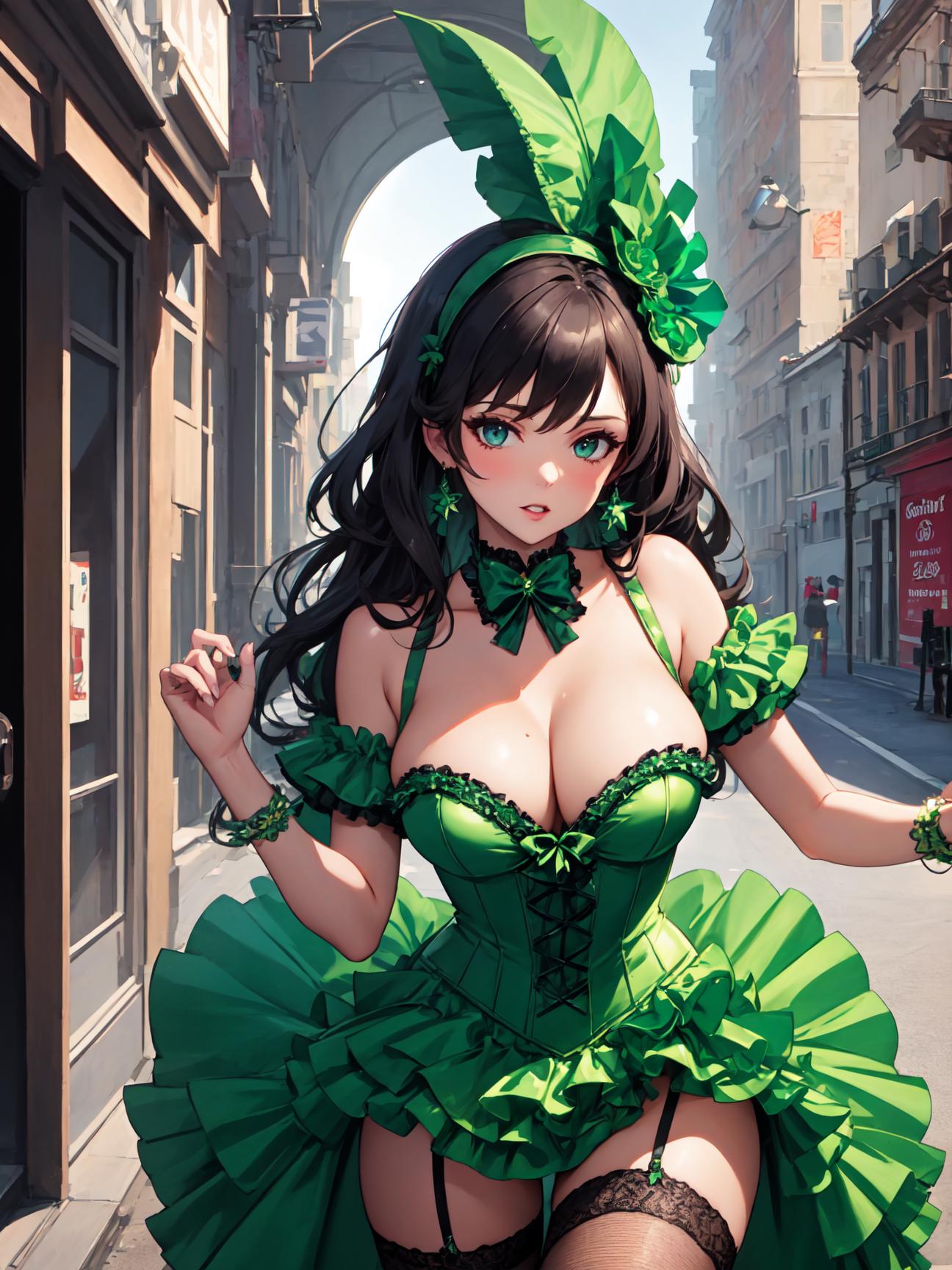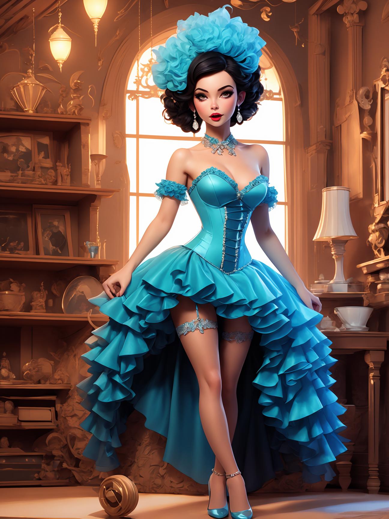 Burlesque attire started as a parody of high fashion and more serious works, but wound up as a style all of its own. Nowdays these dresses are known for their over-the-top lines and silhouettes.