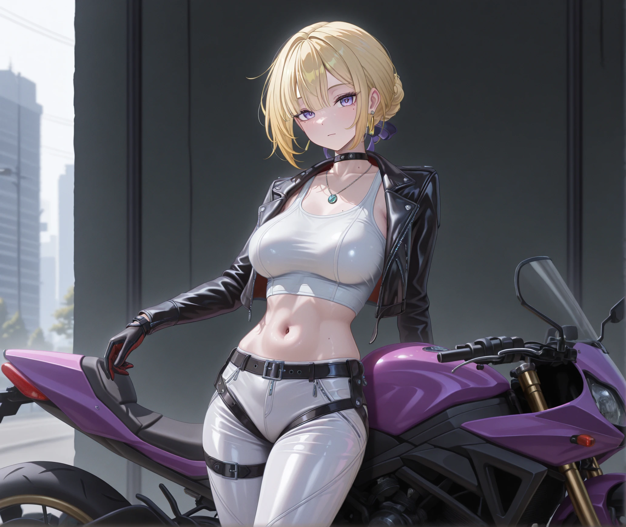 ZZZEvelyn, blonde hair, short hair, bangs, hair bun, purple eyes, mole, Outfit: