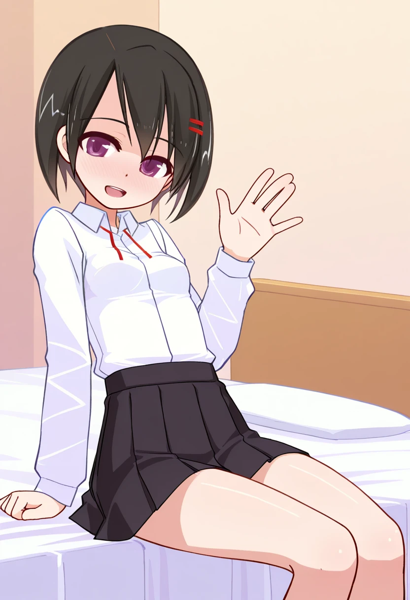 hairclip, white shirt, long sleeves, black skirt, pleated skirt, socks