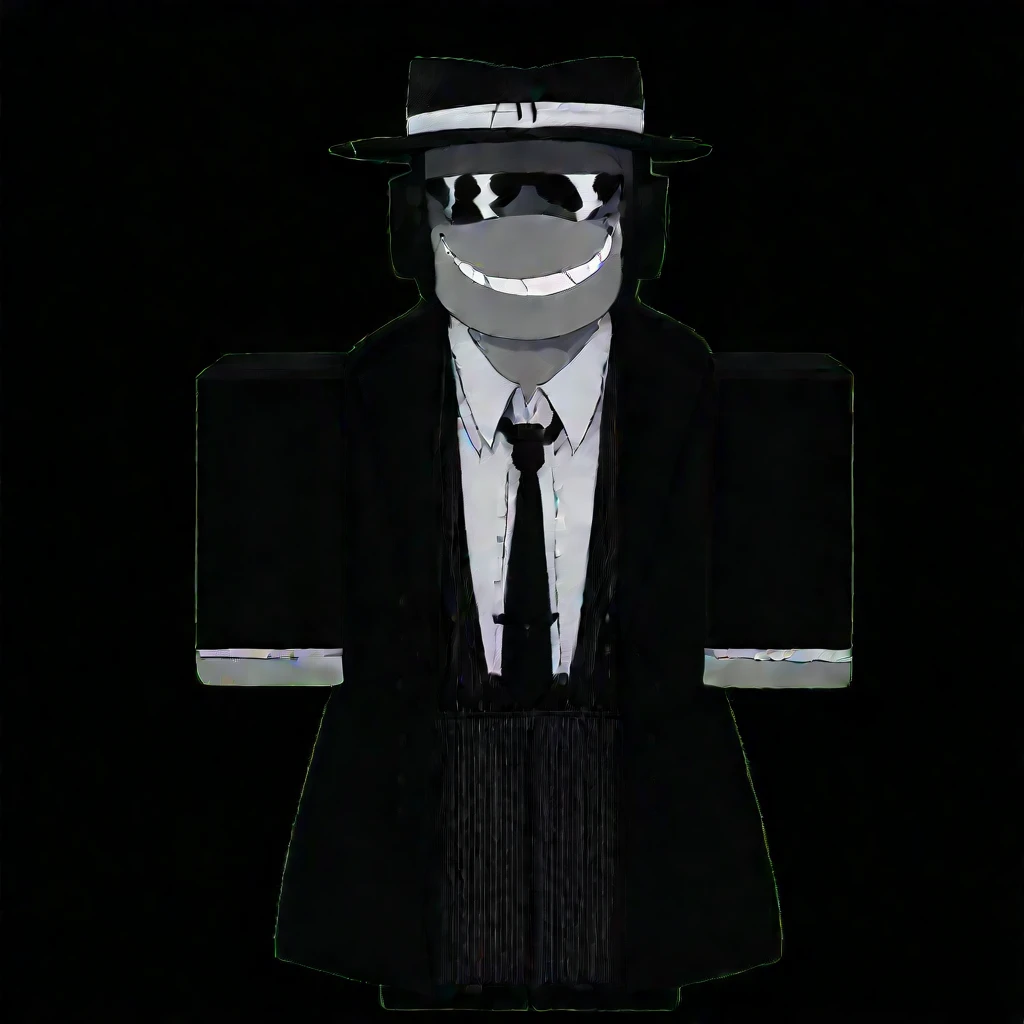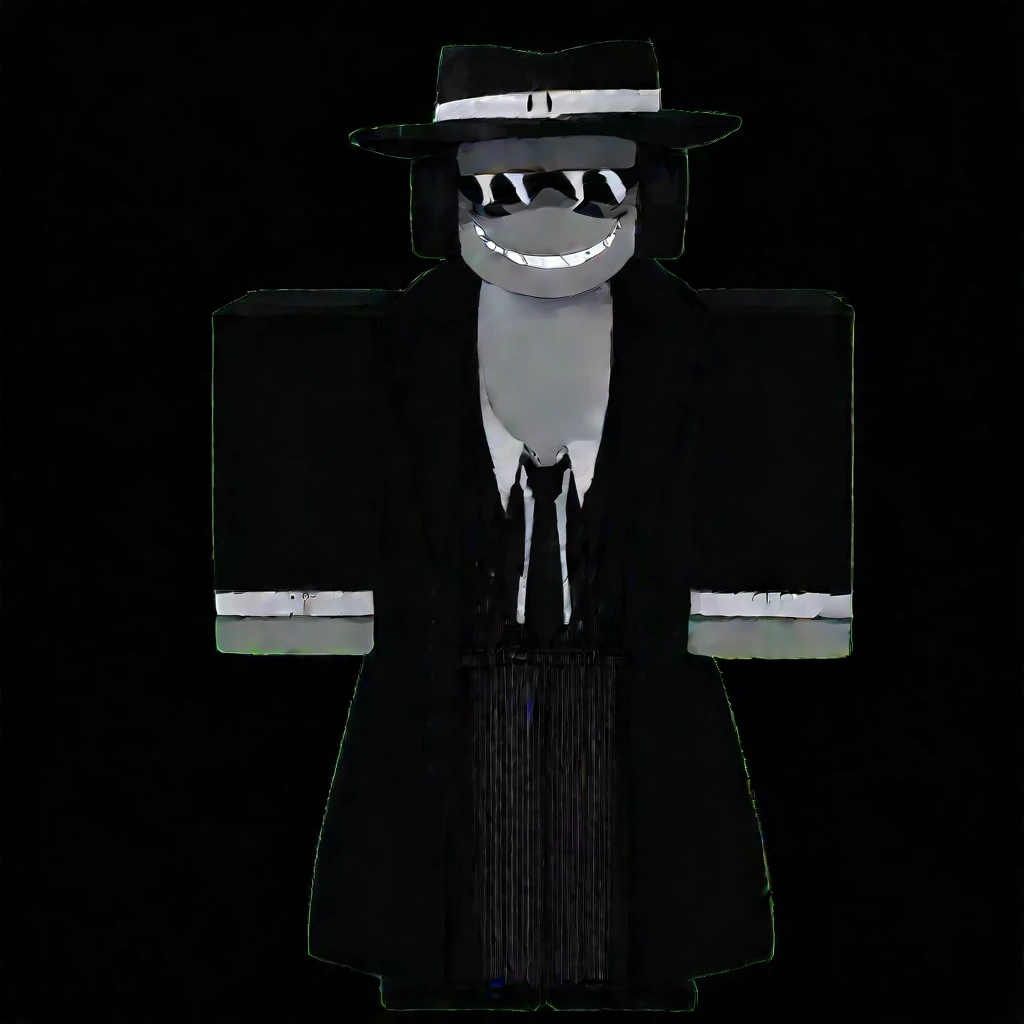 anthro, cartoony, fedora hat, black fedora, formal hat, mysterious expression, dark sunglasses, no visible mouth, black trench coat, striped suit, formal suit, black tie, pinstripe pants, dress shirt, waistcoat, mafia attire, classy outfit, businesswear, gangster aesthetic, black gloves, belted coat, layered clothing square torso, broad shoulders, stylized humanoid, mascot proportions, formal stance, straight posture, character with hat and mask, roblox body, gray skin, black glasses