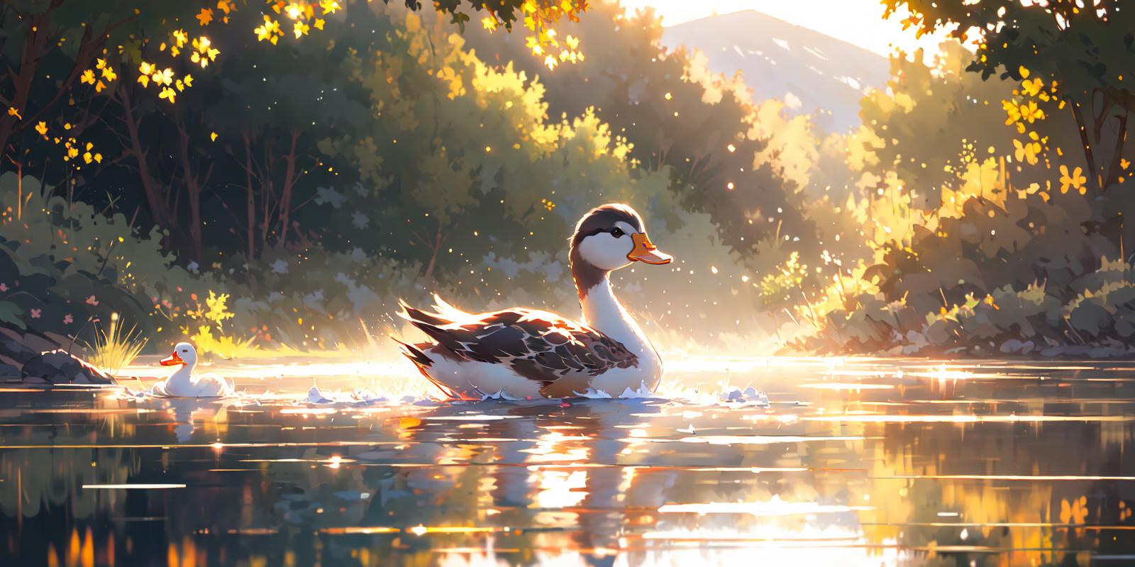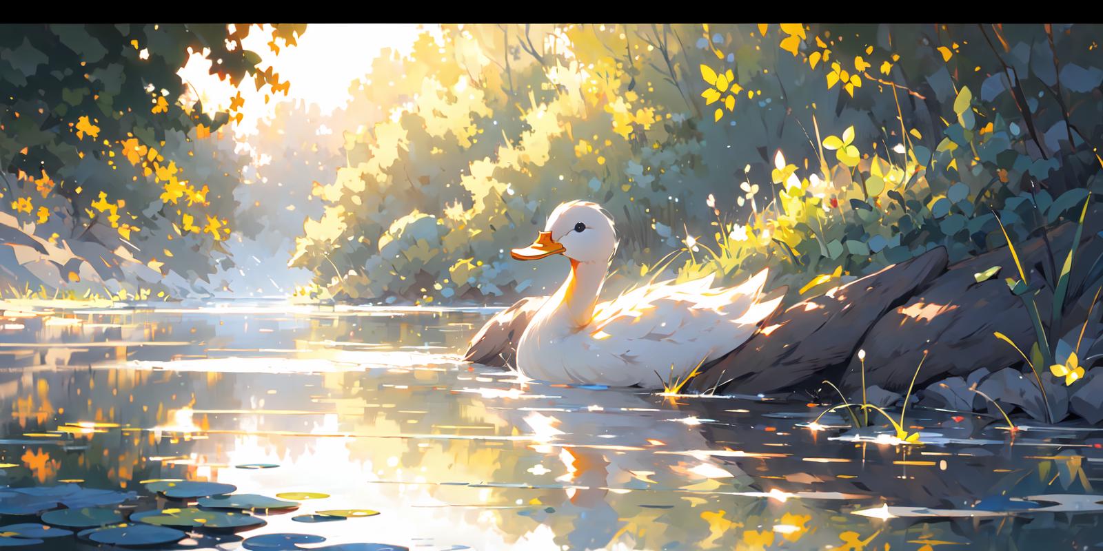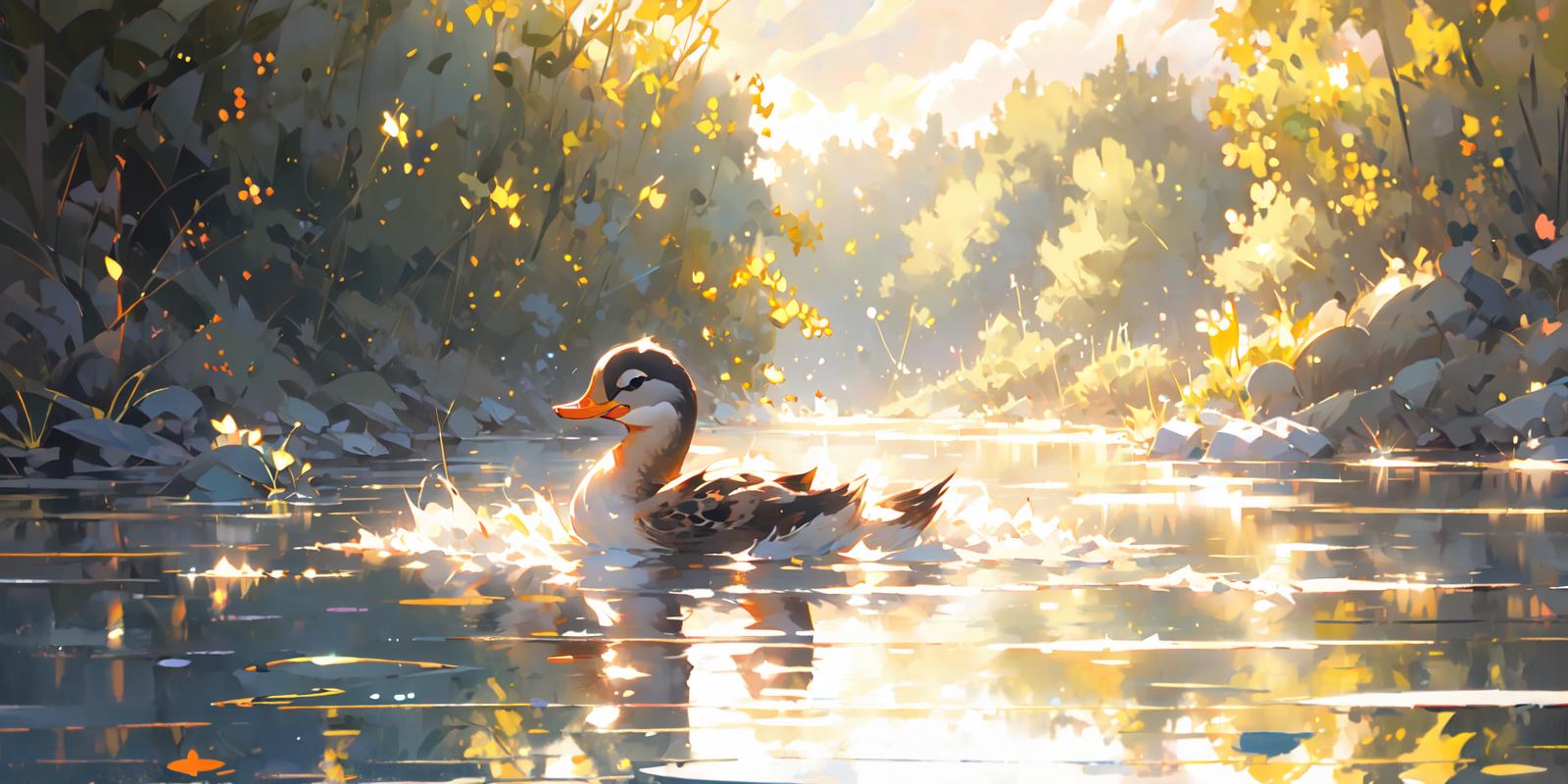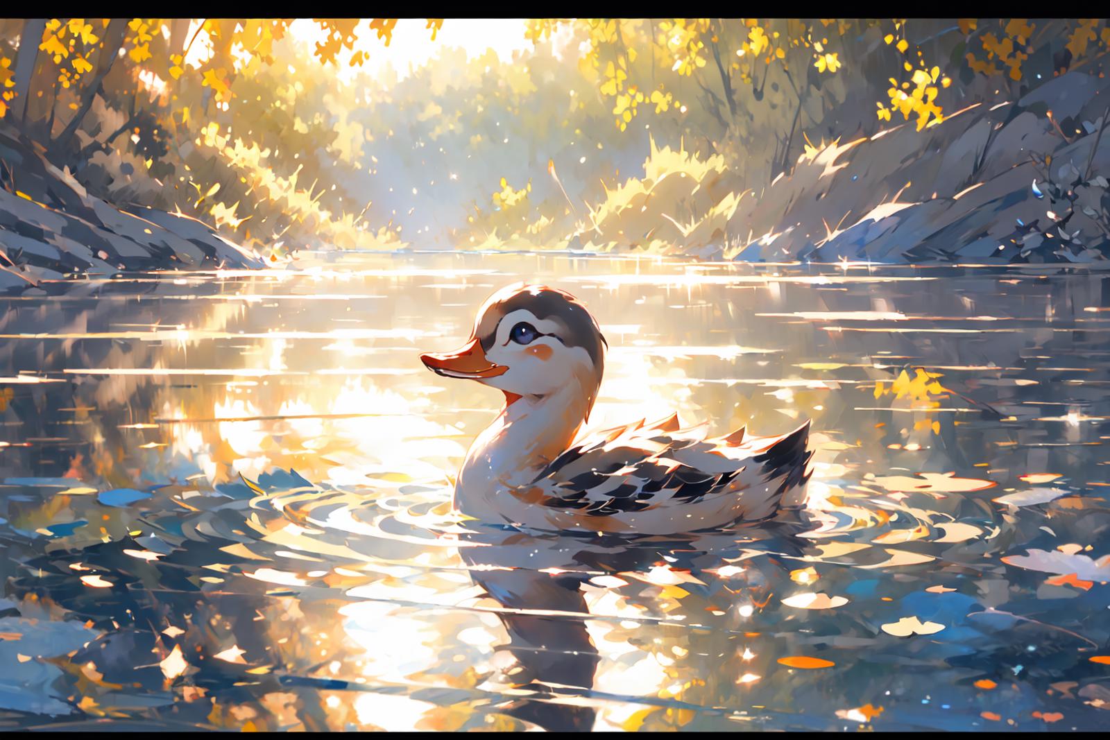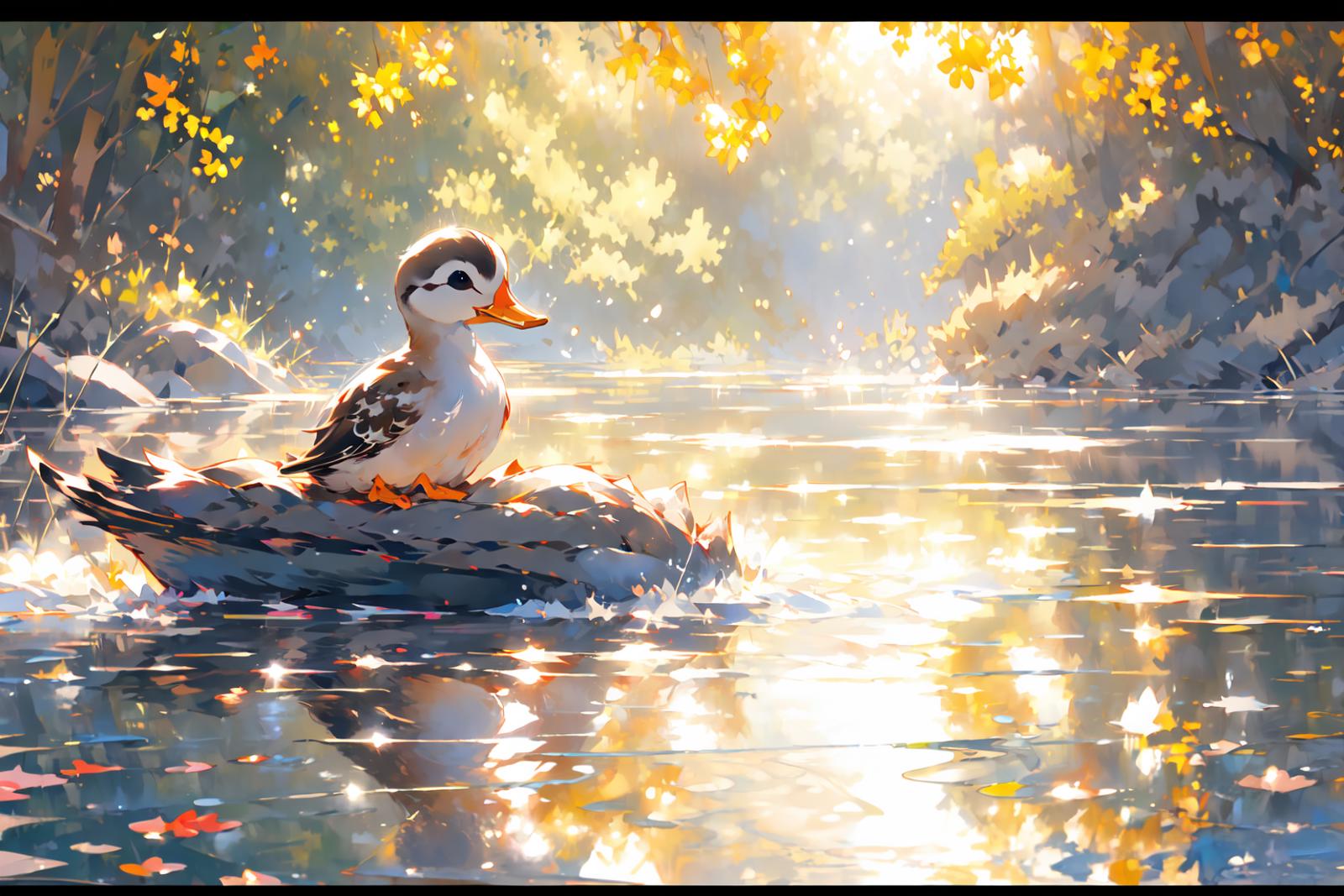 就是niji二次元模型画的小鸭子的画风,不是纯粹的可爱的风格,是稍微有点偏向写实的感觉,然后它会自带波光粼粼的效果和倒影,画面会非常的温暖而富有意境,建议使用权重不要太高,0.8足够了。