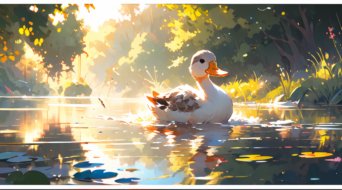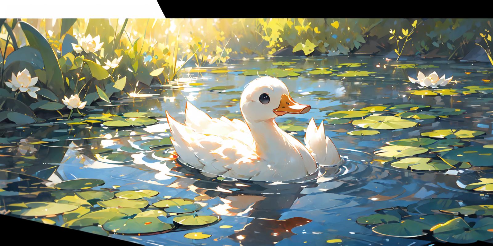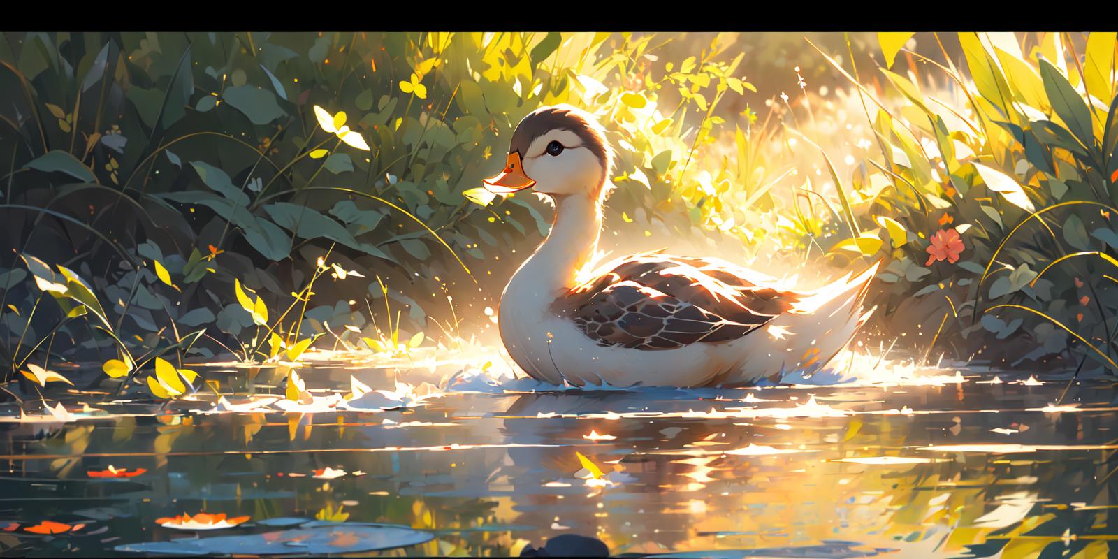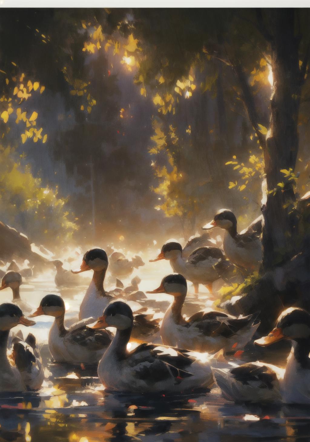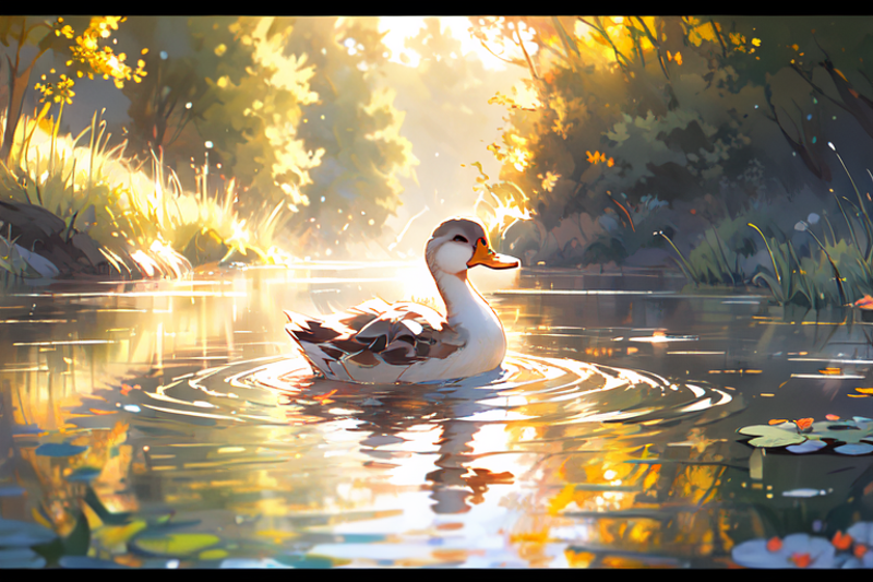 就是niji二次元模型画的小鸭子的画风,不是纯粹的可爱的风格,是稍微有点偏向写实的感觉,然后它会自带波光粼粼的效果和倒影,画面会非常的温暖而富有意境,建议使用权重不要太高,0.8足够了。