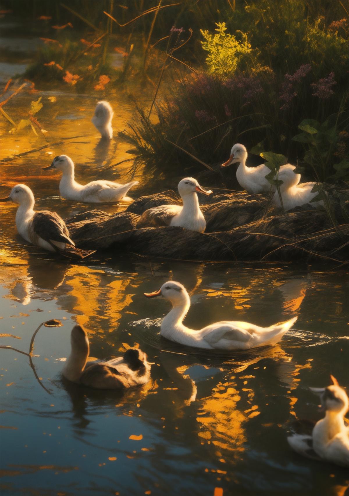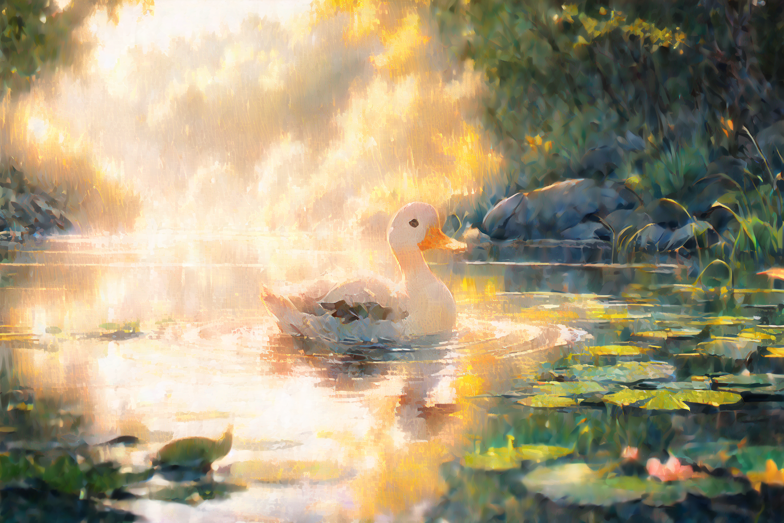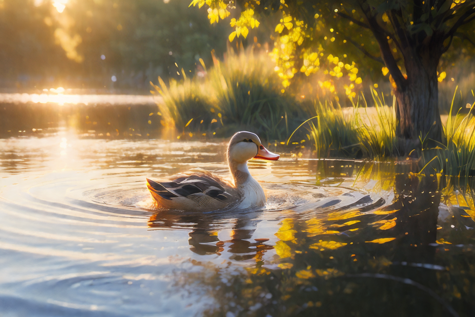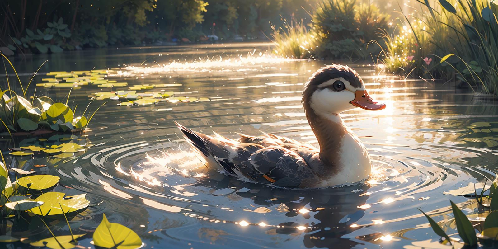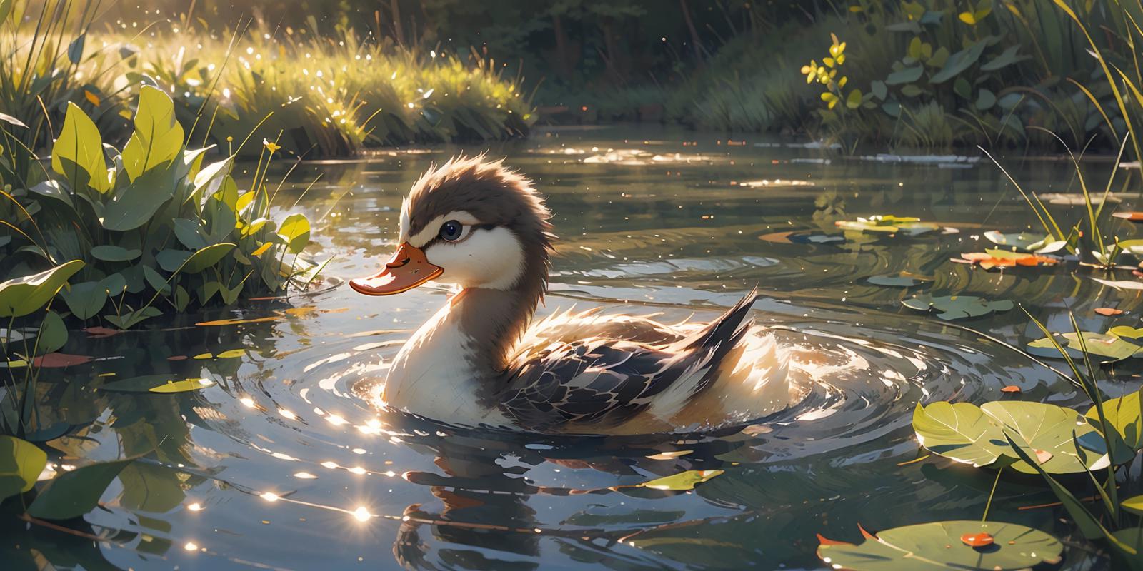 就是niji二次元模型画的小鸭子的画风,不是纯粹的可爱的风格,是稍微有点偏向写实的感觉,然后它会自带波光粼粼的效果和倒影,画面会非常的温暖而富有意境,建议使用权重不要太高,0.8足够了。