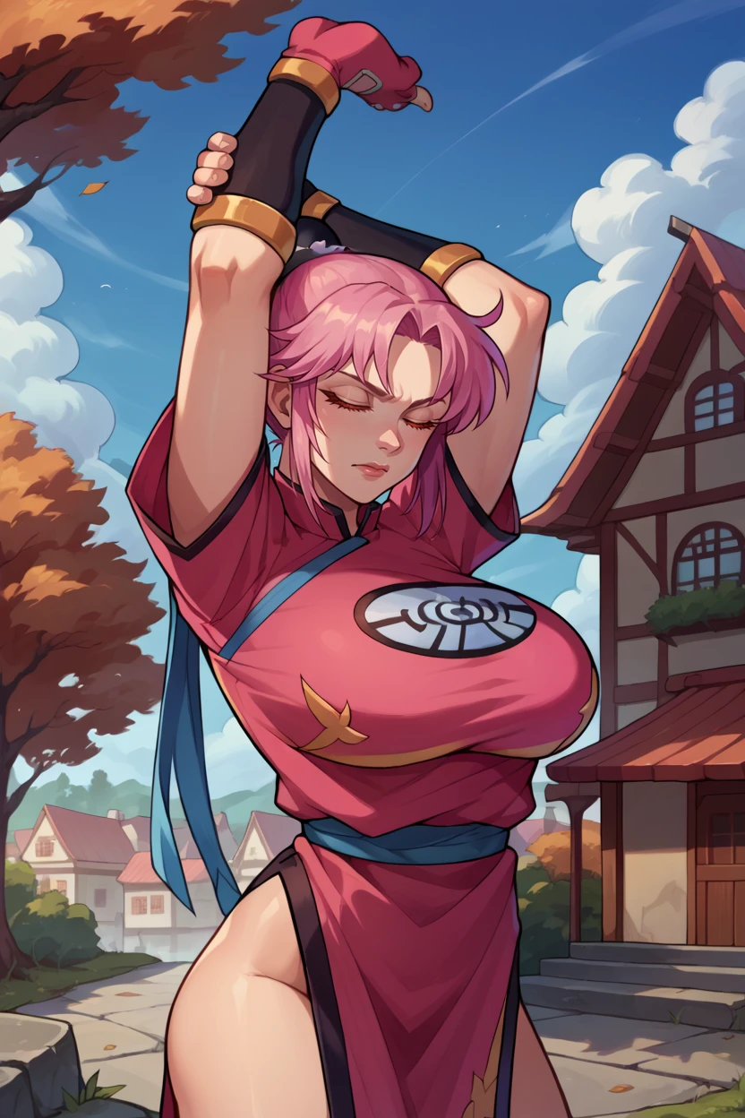Add "martialMaam, pink hair, orange eyes, hair bun, short hair, china dress, short sleeves, sash, fingerless gloves, single shoulder pad" for her Martial Artist outfit.