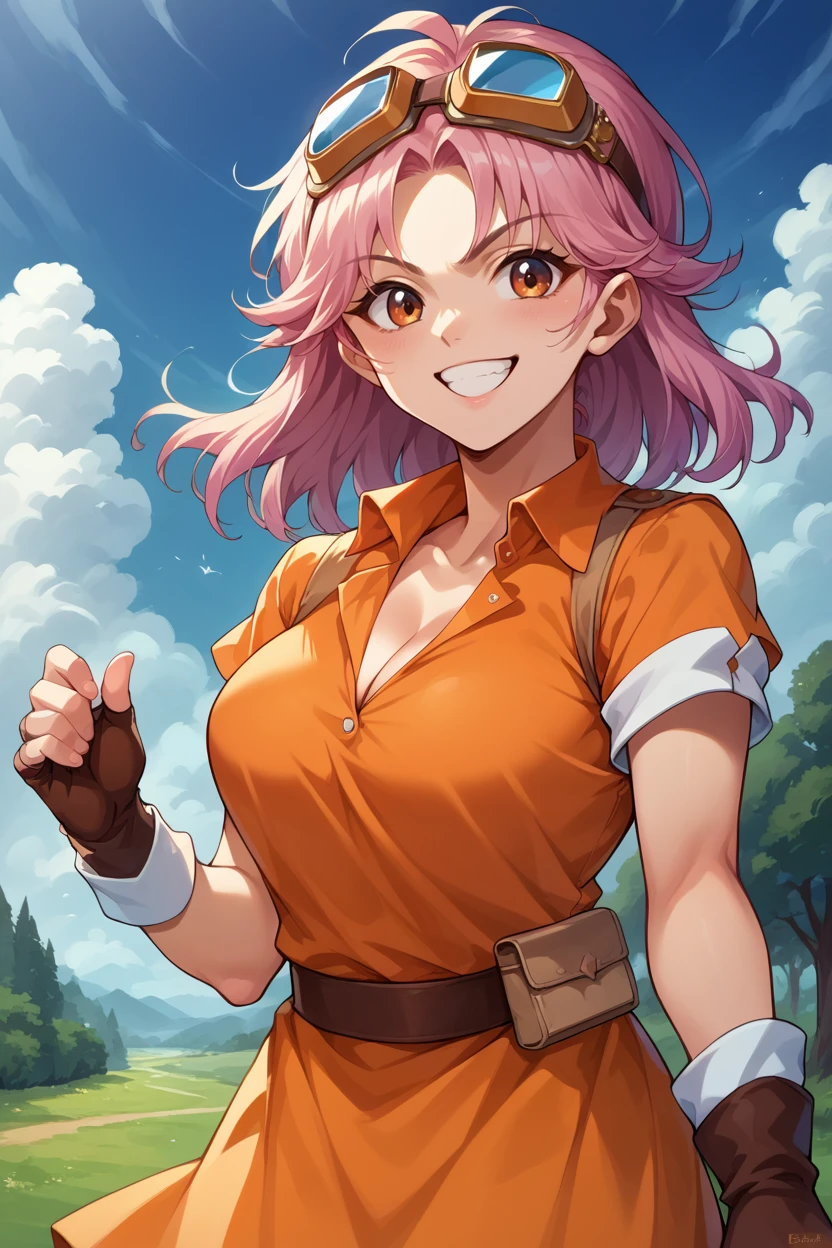Add "plainMaam, pink hair, orange eyes, medium hair, goggles on head, orange shirt, short sleeves, cleavage, orange skirt, brown gloves, fingerless gloves" for her orange dress.