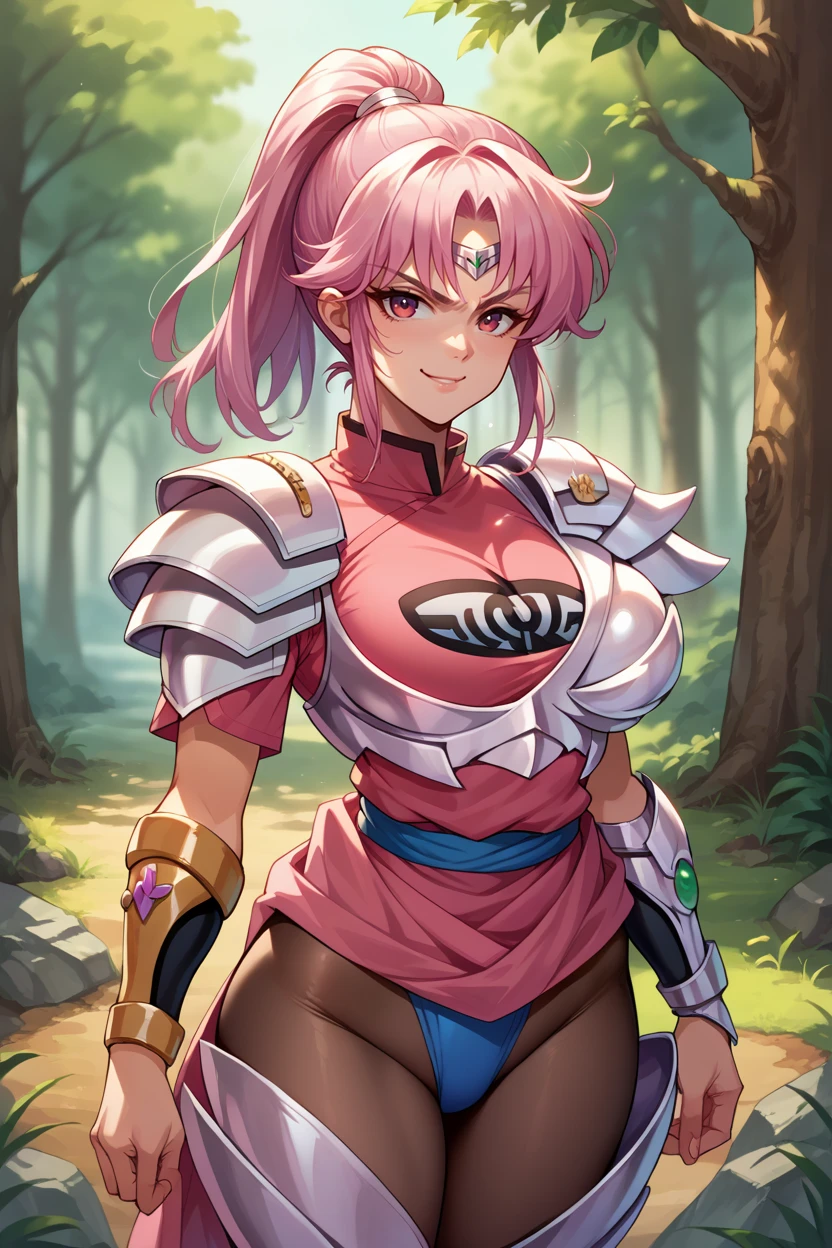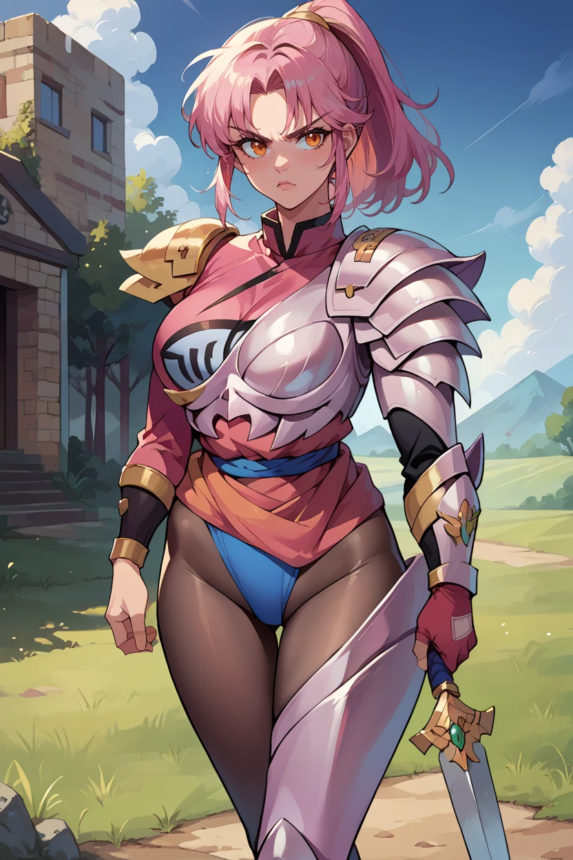 Add "armorMaam, pink hair, orange eyes, ponytail, armored dress, pink armor, armored legwear, single gauntlet, pantyhose" for her armored outfit.