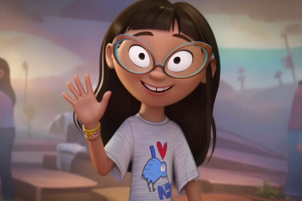 Abbey, 1girl, solo, asian, slim, thin, thin limbs, dark brown hair, long hair, black eyes, small pupils, glasses, tooth gap, gray print shirt, skirt, blue skirt, purple socks, white sandals.