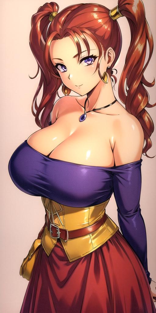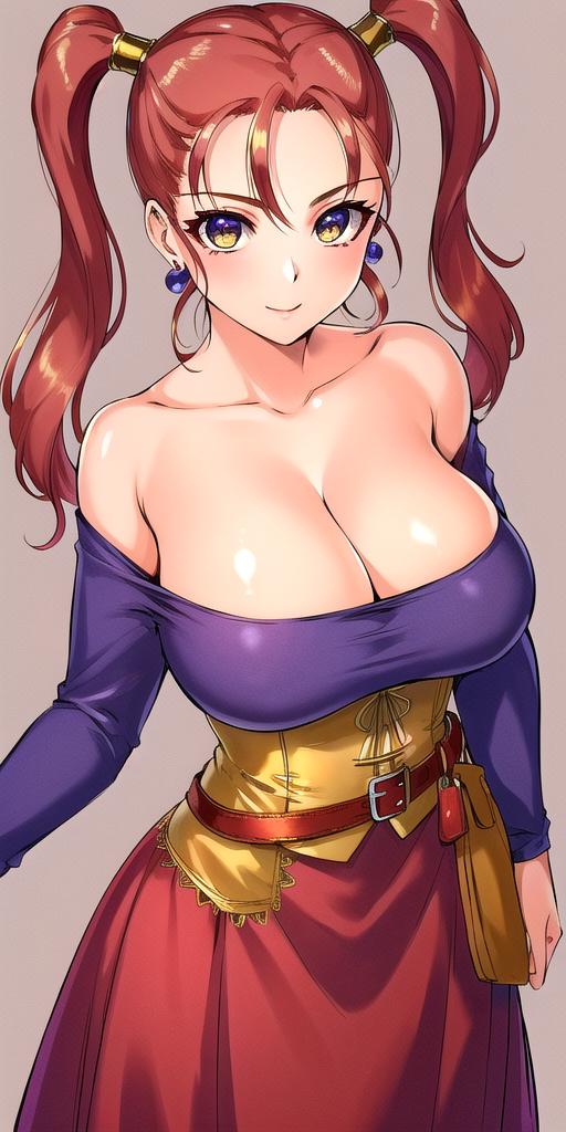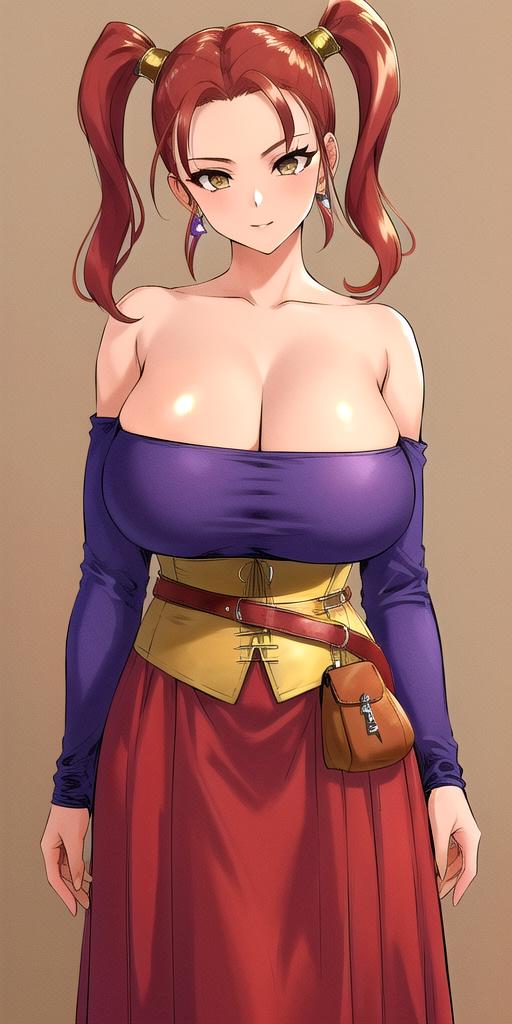 Purple_off-shoulder_shirt_Long_sleeves_Cleavage_Yellow_corset_Red_long_skirt_Belt_Pouch: Her default outfit.