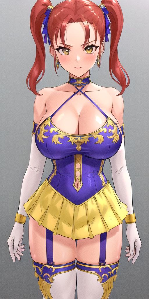 Blue_leotard_Yellow_microskirt_White_elbow_gloves_White_thighhighs_Garter_straps_Bracelet_Feathered_wings_Navel_cutout: Her slutty leotard outfit.