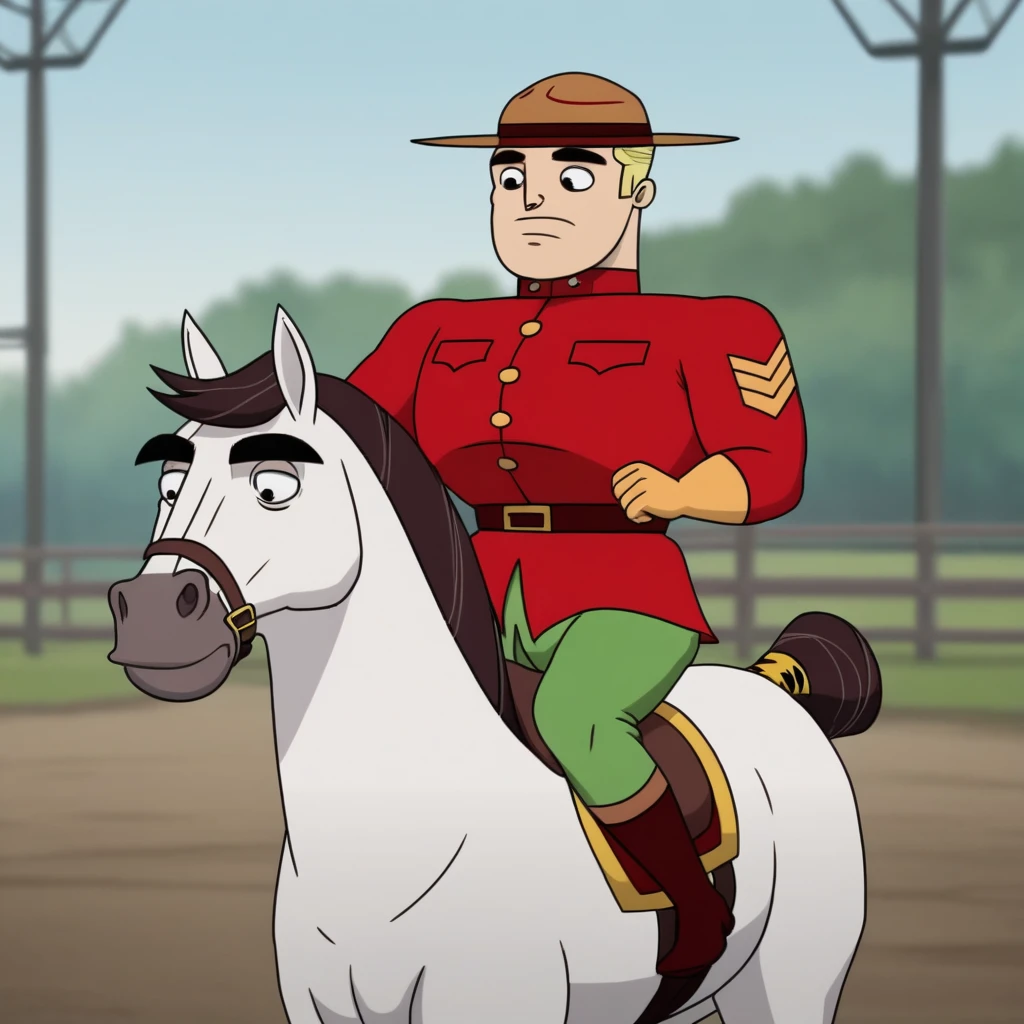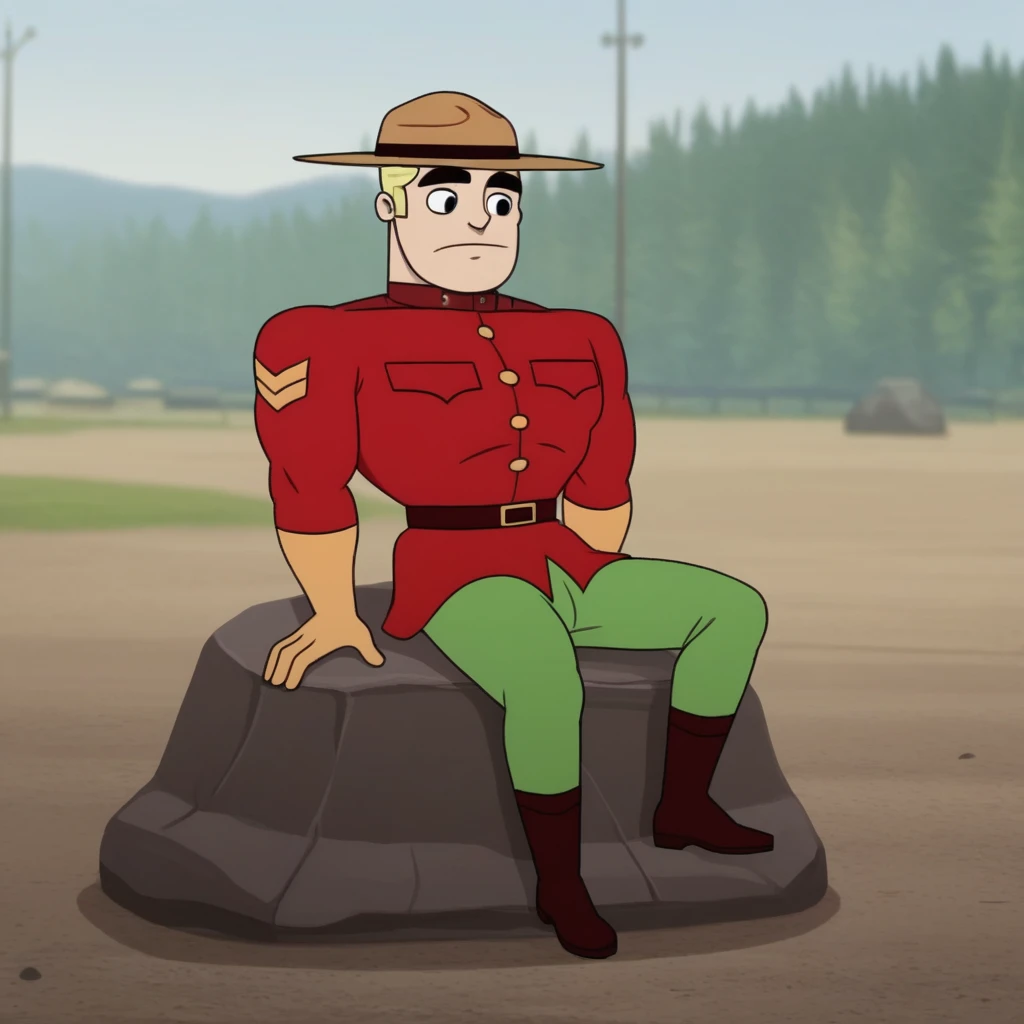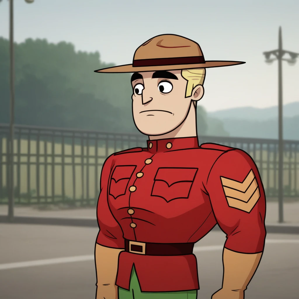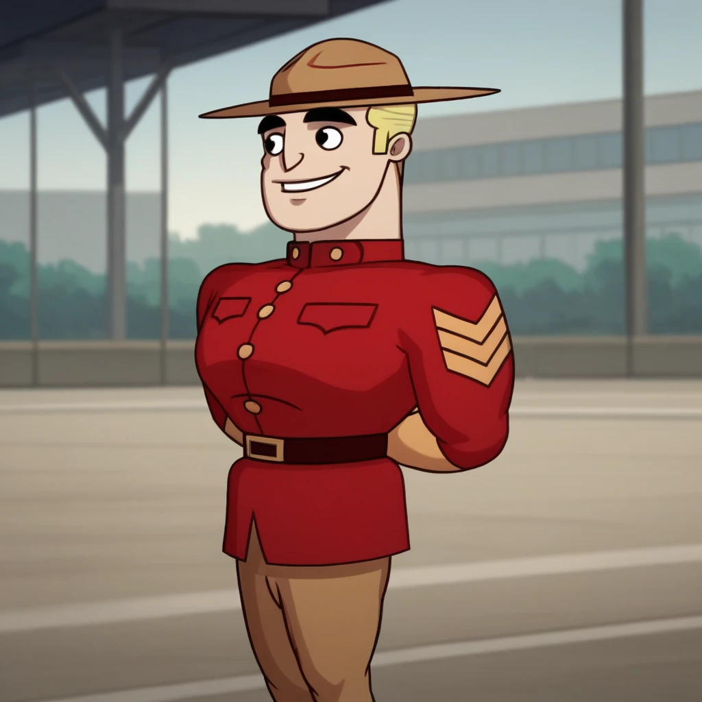 StraitMccool, 1boy, solo, blonde hair, thick eyebrows, black eyes, hat, uniform, red uniform, muscular,