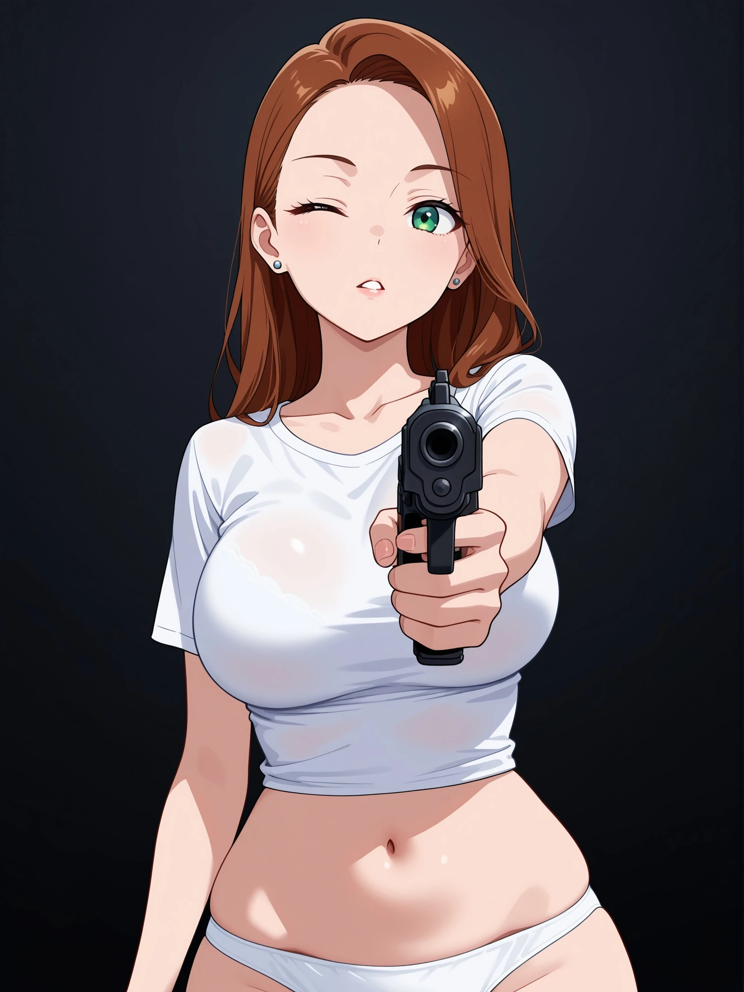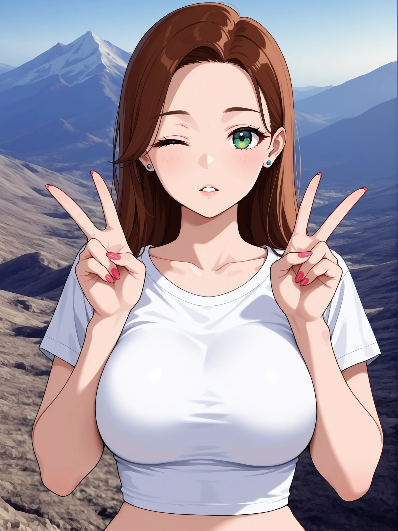 pilot (close encounters), 1girl, brown hair, long hair, green eyes, stud earrings