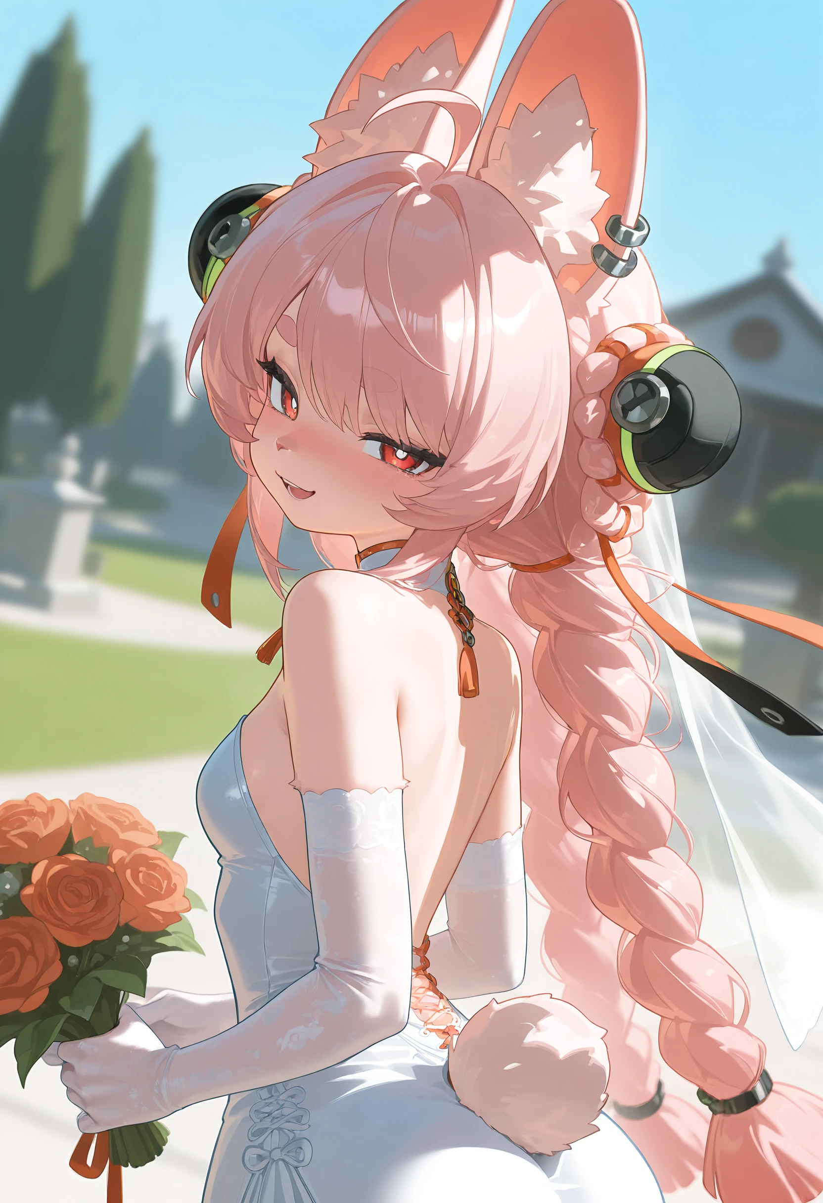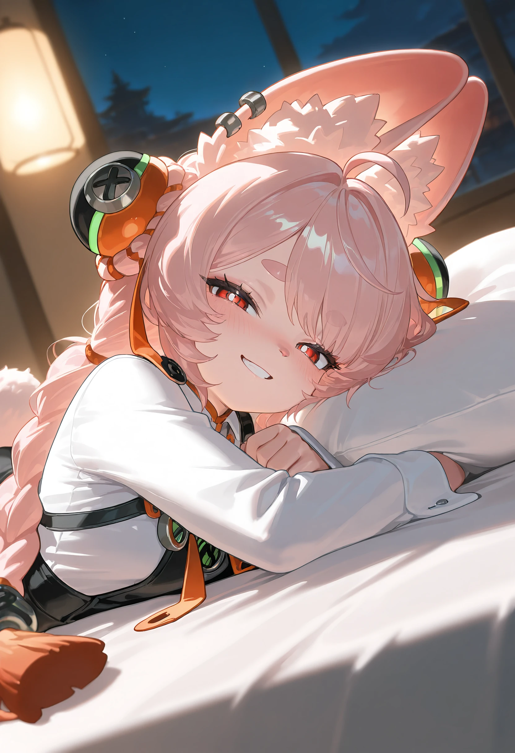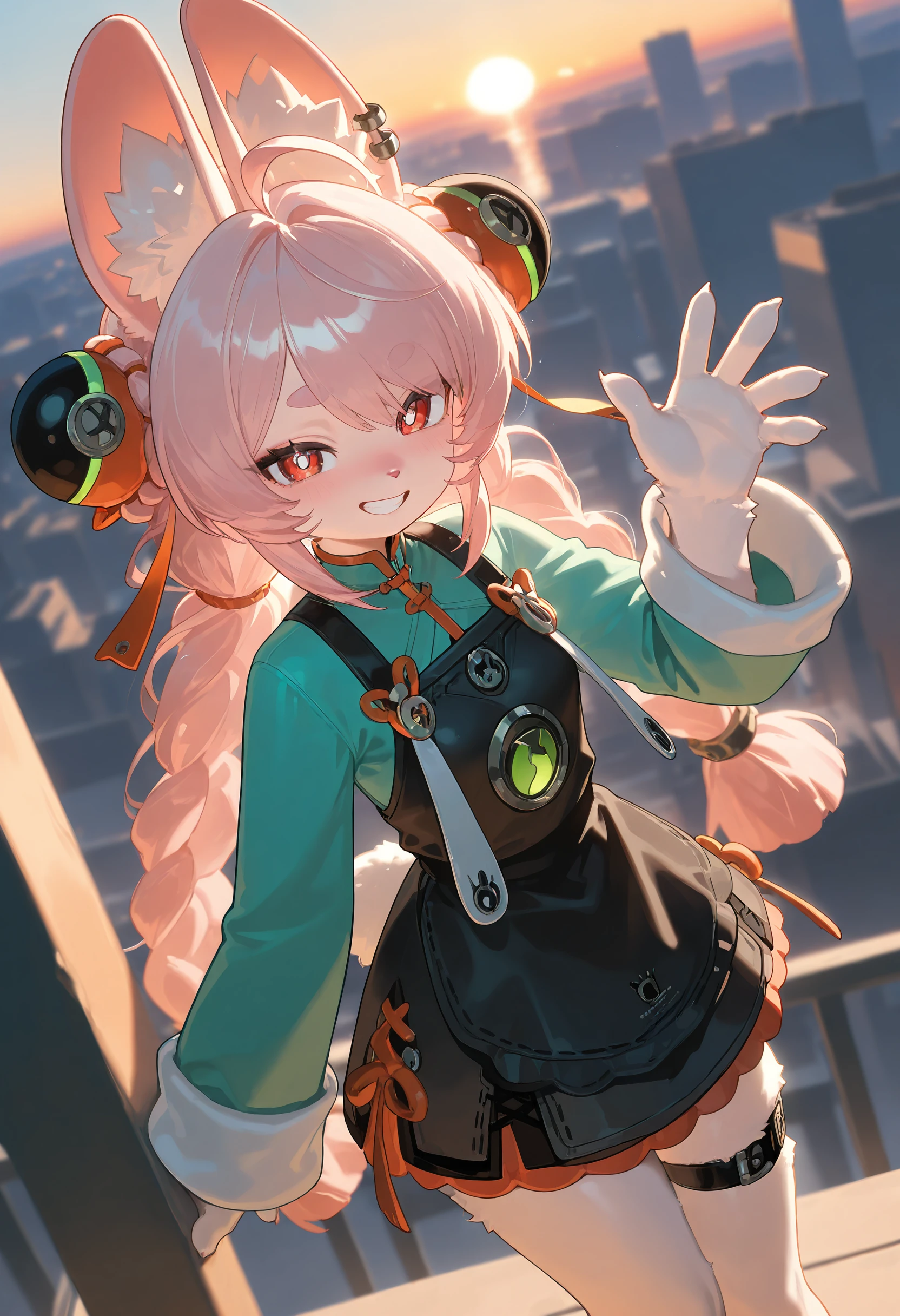 Tags for her look: 1girl, solo, small breasts, long hair, red eyes, white pupils, twintails, pink hair, ahoge, braid, twin braids, animal ear fluff, rabbit ears, rabbit girl, rabbit tail, bright pupils, tassel, furry female, body fur, white fur, animal nose, jewelry, earrings, ear piercing, tassel hair ornament, thick eyebrows,