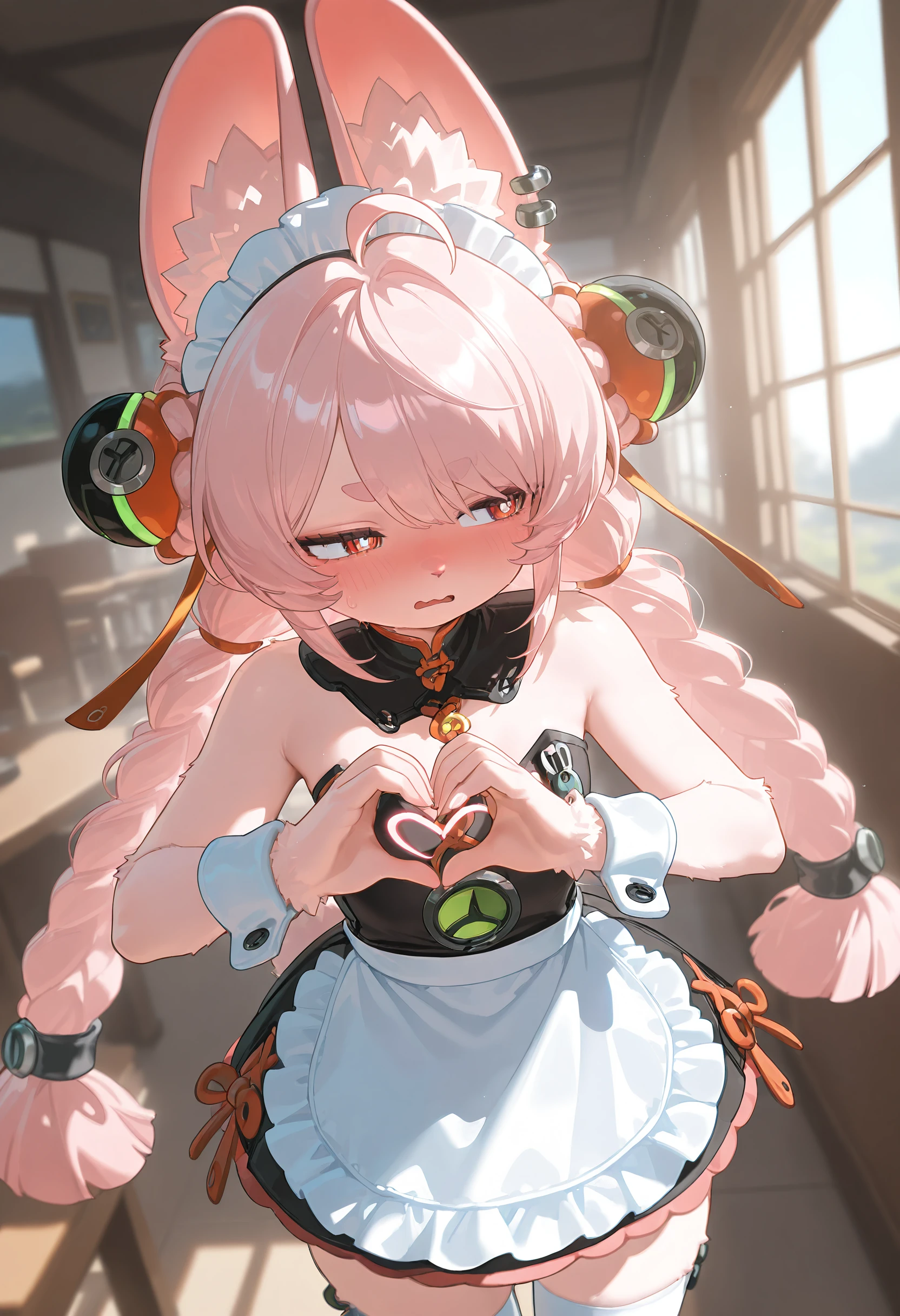 1girl, solo, small breasts, long hair, red eyes, white pupils, twintails, pink hair, ahoge, braid, twin braids, animal ear fluff, rabbit ears, rabbit girl, rabbit tail, bright pupils, tassel, furry female, body fur, white fur, animal nose, jewelry, earrings, ear piercing, tassel hair ornament, thick eyebrows,