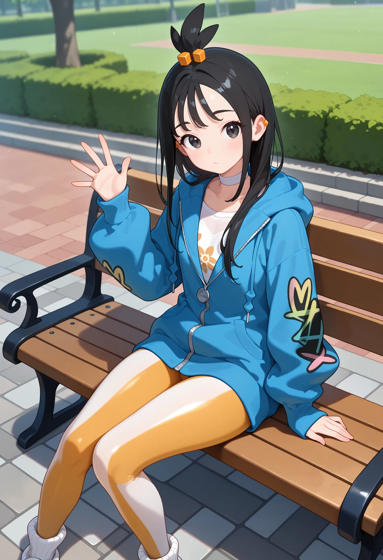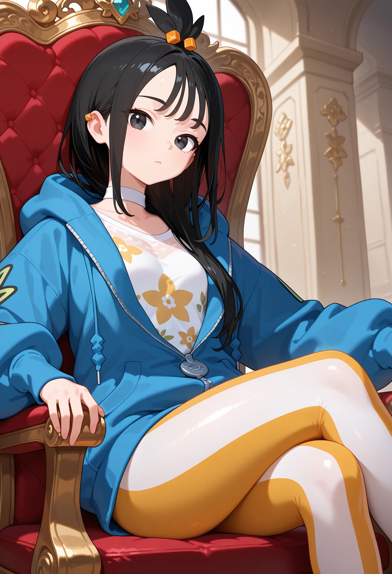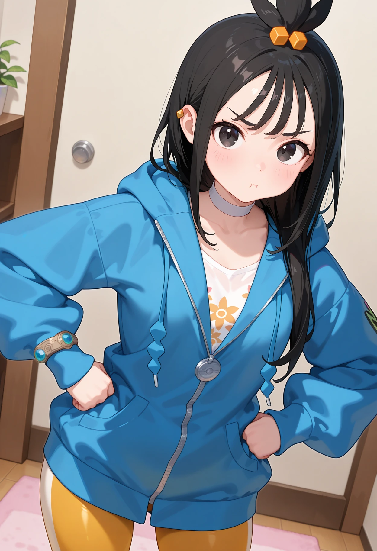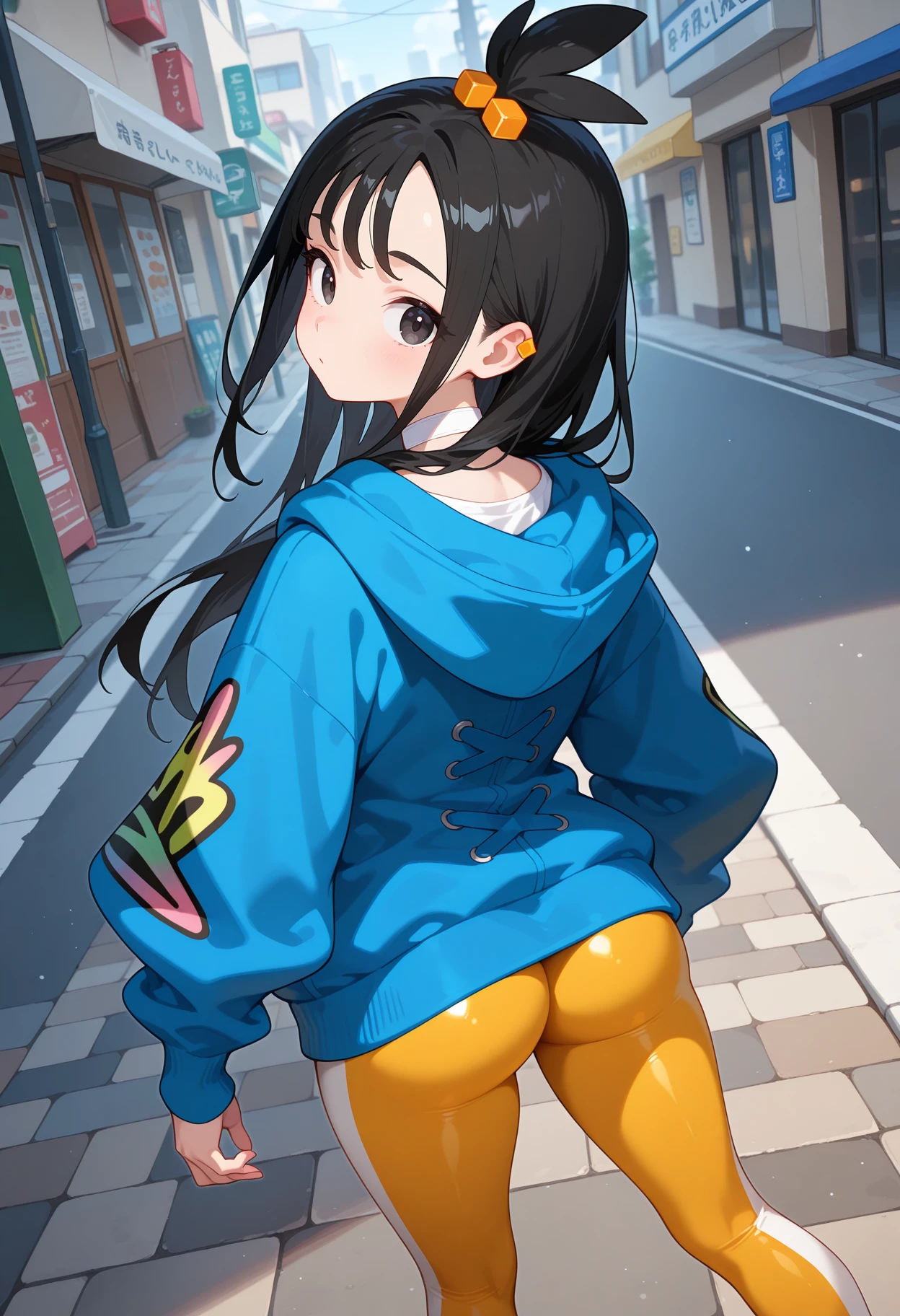 outfit1aalida, long hair, black hair, topknot, hair ornament, ear piercing, black eyes, white choker, white shirt, blue jacket, hooded jacket, long sleeves, leggings, tight pants, multicolored pants