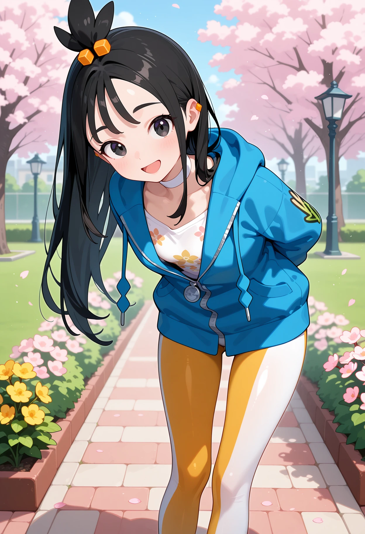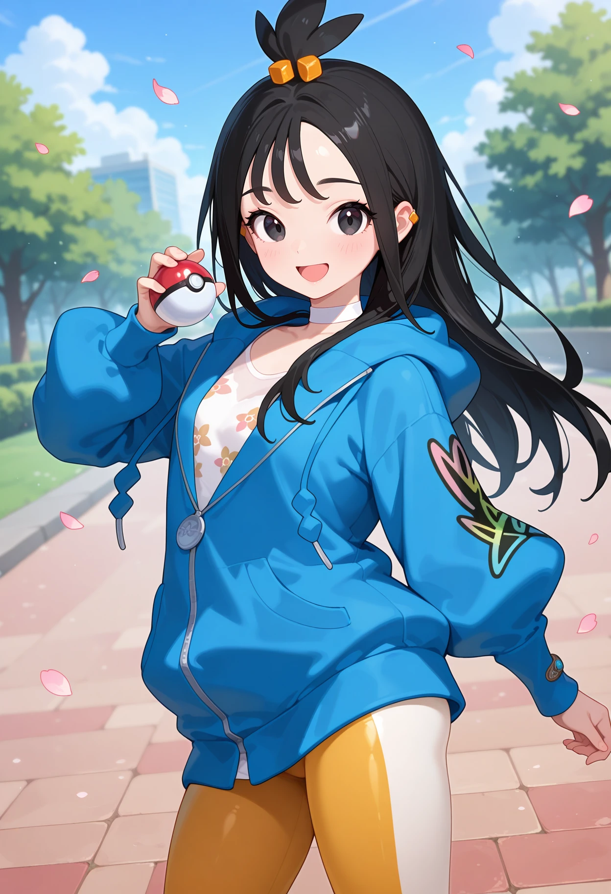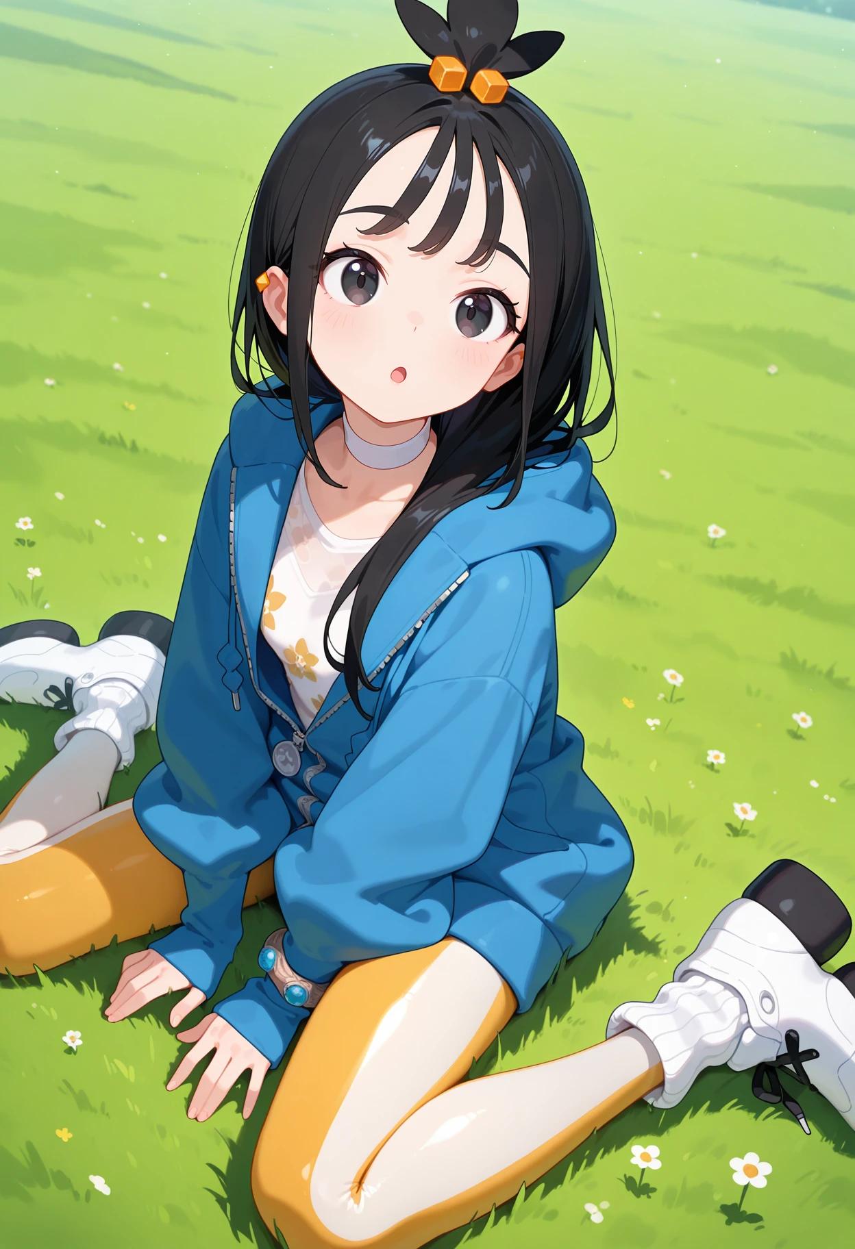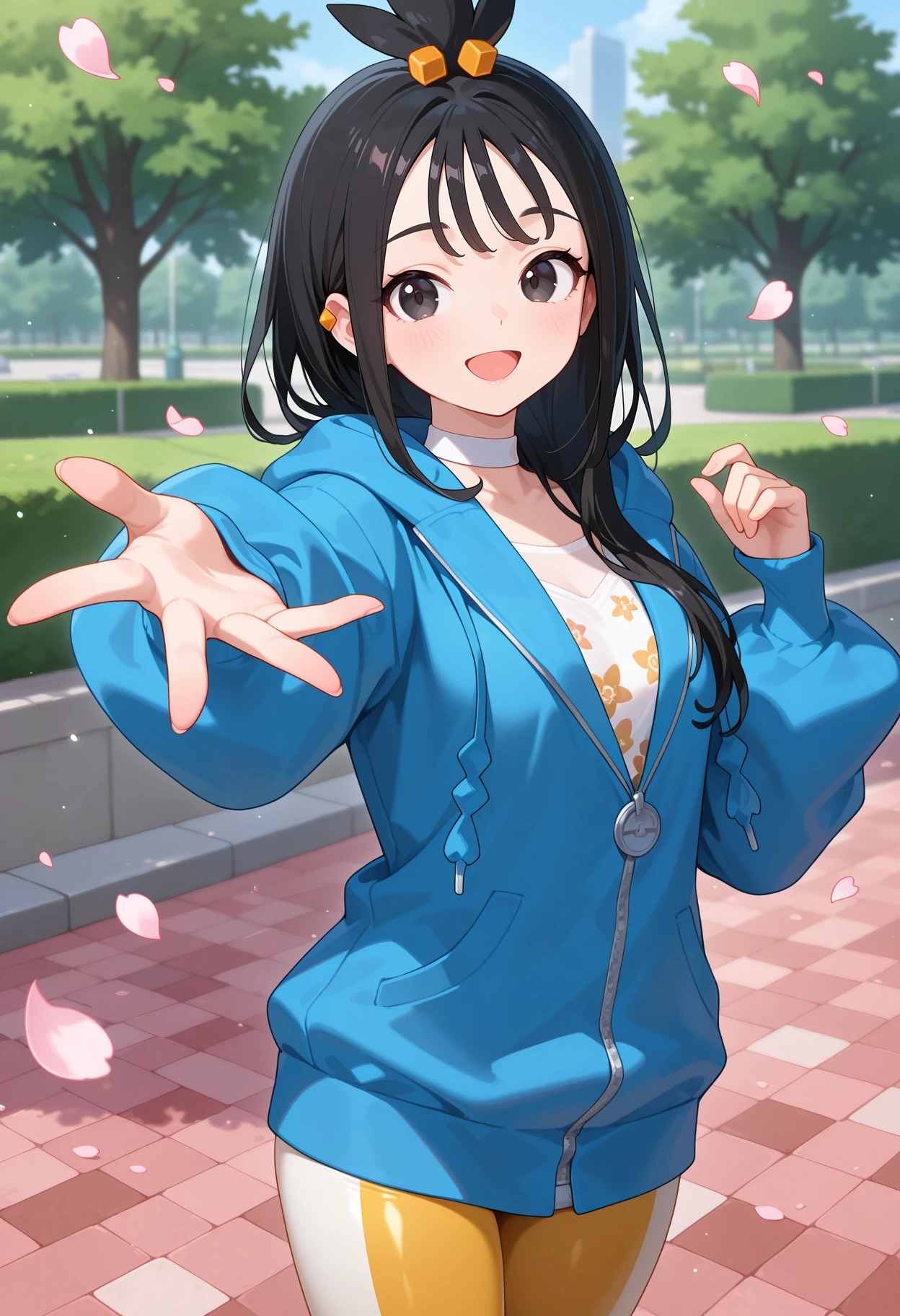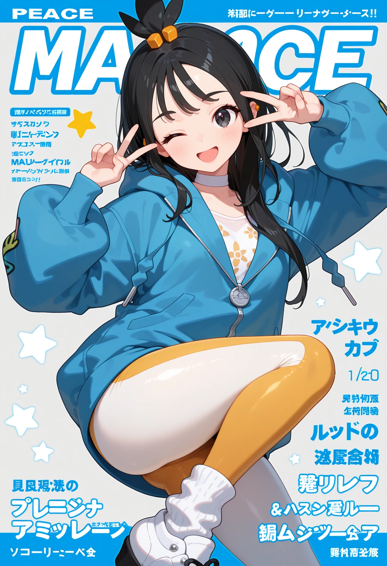 outfit1aalida, long hair, black hair, topknot, hair ornament, ear piercing, black eyes, white choker, white shirt, blue jacket, hooded jacket, long sleeves, leggings, tight pants, multicolored pants