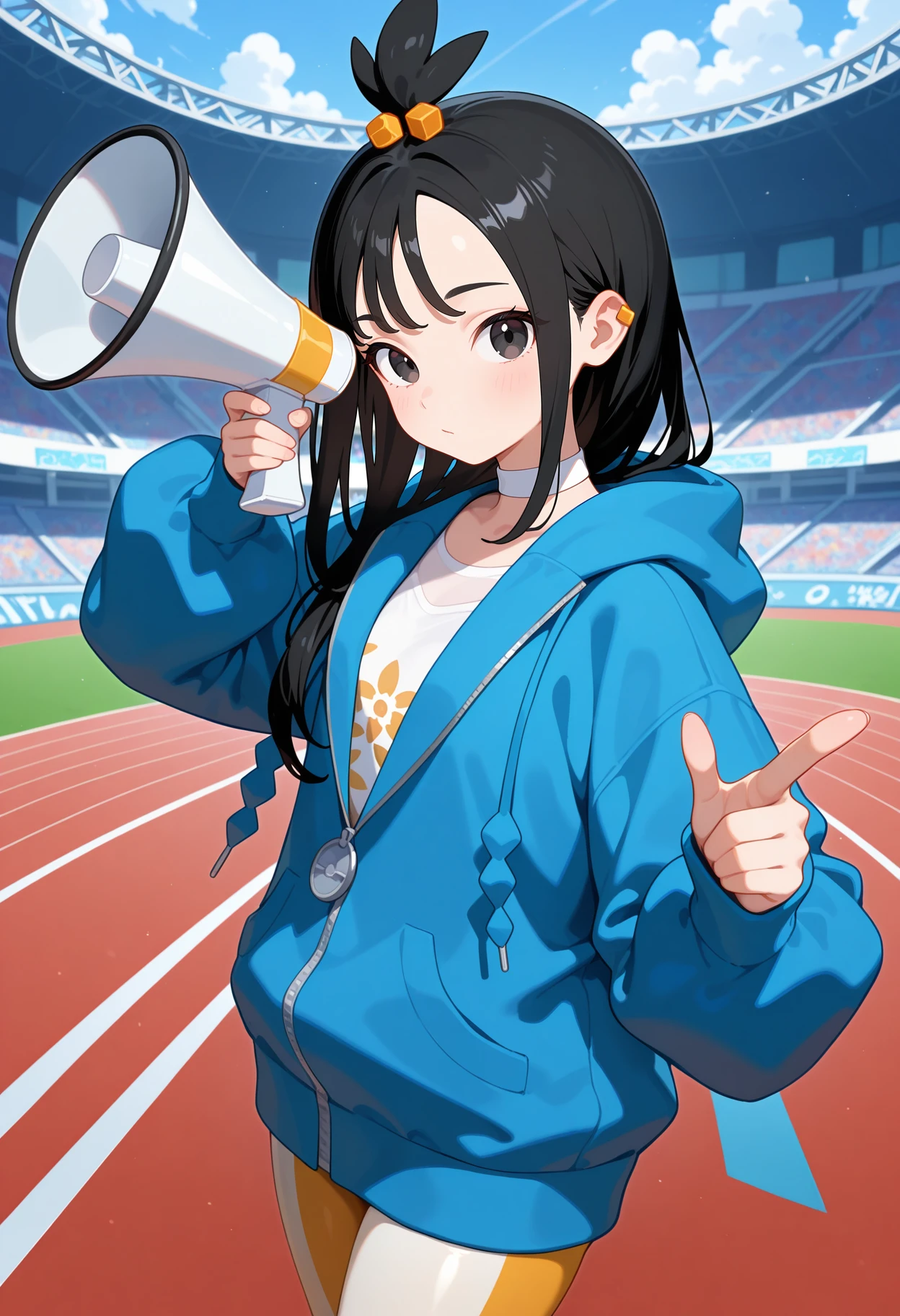 aalida, long hair, black hair, topknot, hair ornament, ear piercing, black eyes, white choker, white shirt, blue jacket, hooded jacket, long sleeves, leggings, tight pants, multicolored pants