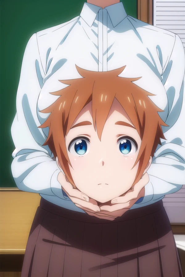 kyouko machi, short hair, blue eyes, brown hair, fire, blue fire, (disembodied head:1.5), (holding head:1.5),