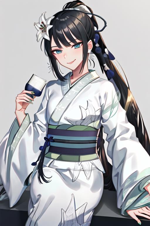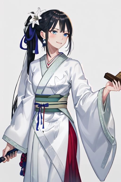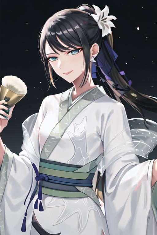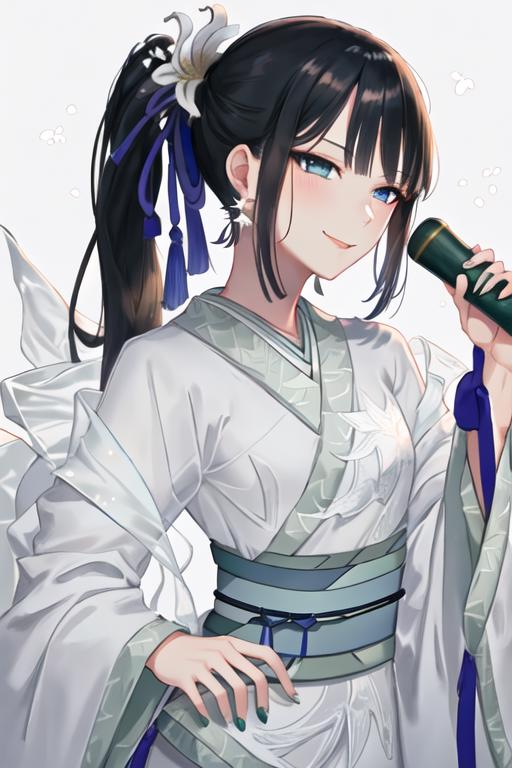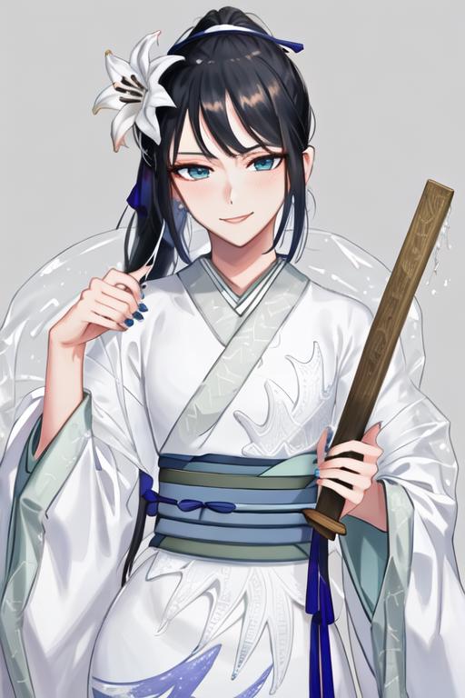The trigger word is jing_ke_fgo, and the recommended tags are best quality, masterpiece, highres, solo, {jing_ke_fgo:1.15}, long_hair, black_hair, bangs, earrings, jewelry, smile, ponytail, blue_eyes, green_eyes, hair_ornament, hair_flower.