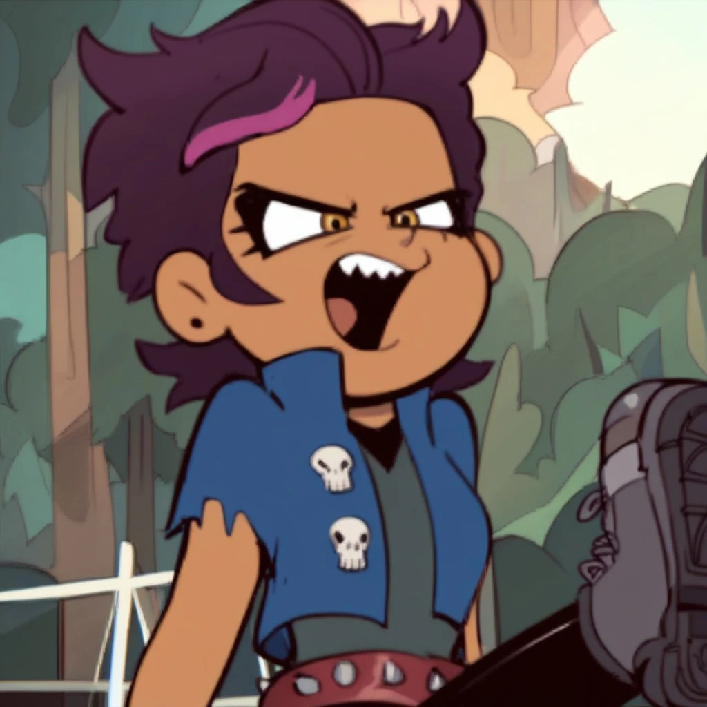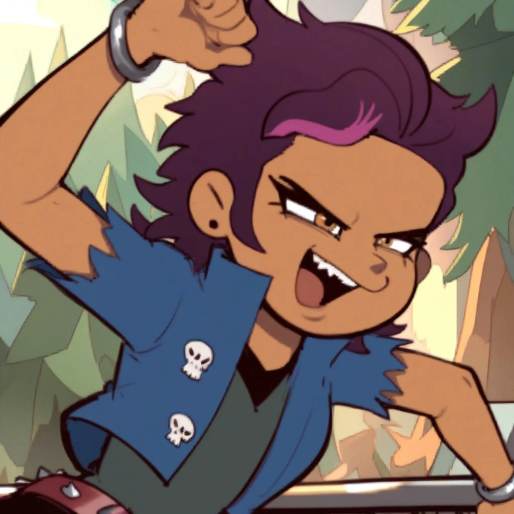 Luzifer, tan skin, golden brown eyes, purple hair, pink streak hair,