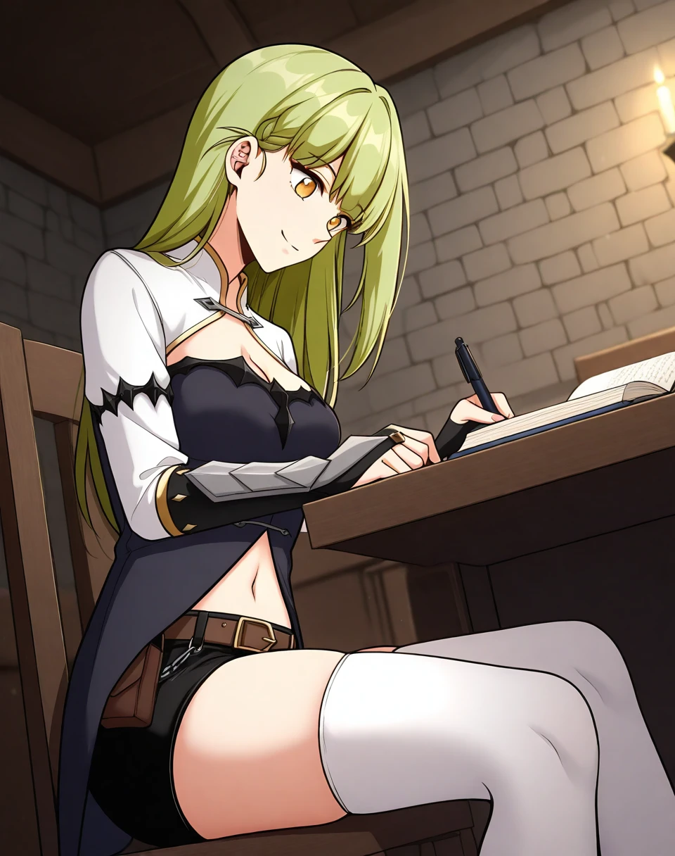 witch clothes,navel, white thighhighs, short shorts, medium breasts, midriff, collared shrug, white shrug, black strapless shirt, arm guard, black shorts, belt