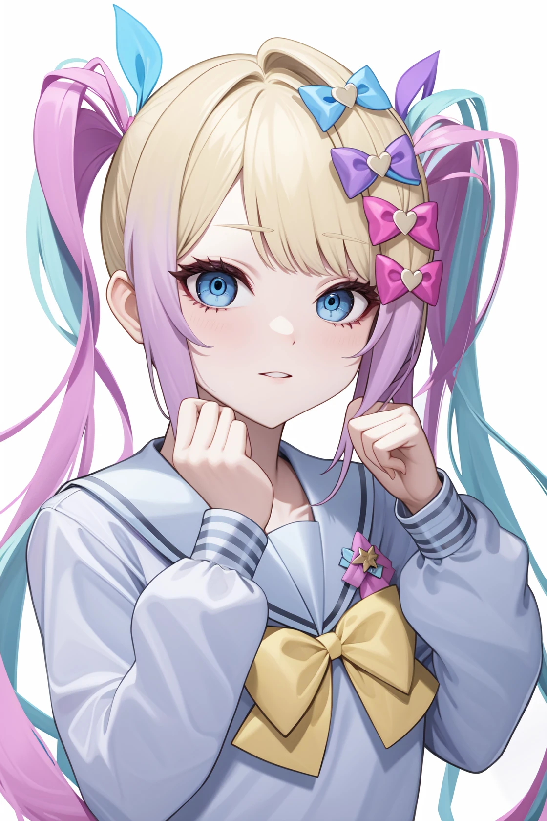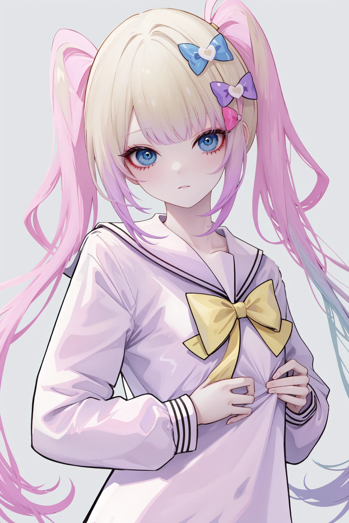 chaotian, multicolored hair, pink hair, blue hair, bow, quad tails, hair bow, long hair, blue eyes, bangs, school uniform, sailor collar, serafuku, blonde hair, twintails, long sleeves, blue bow, shirt, purple bow