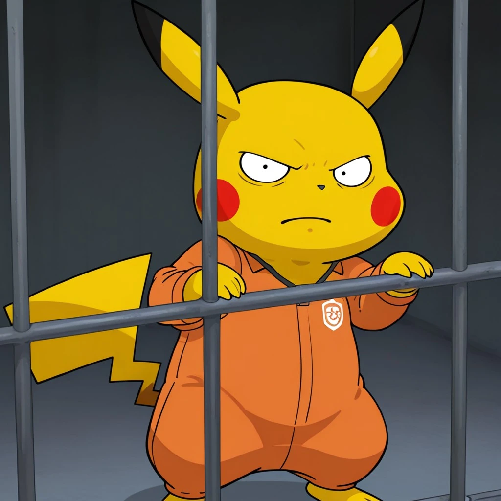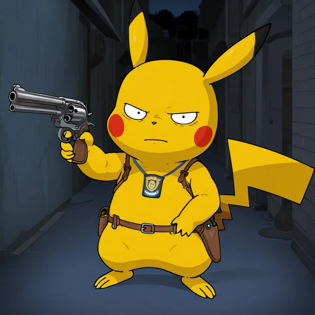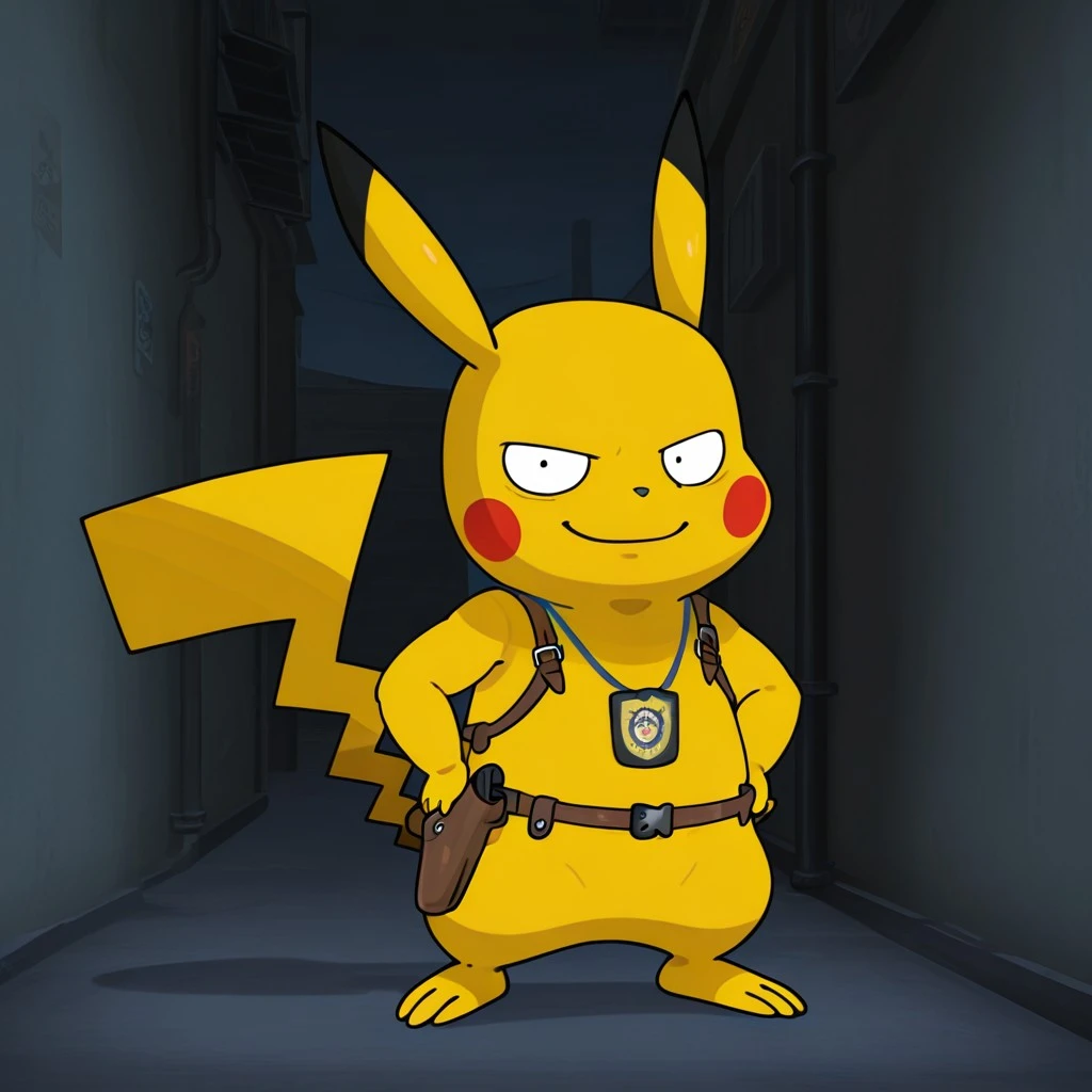 semi-feral, male furry, pokemon (creature), pikachu, yellow fur, black eyes, black nose, pikachu ears, red cheeks, pikachu tail, Gun holster, police badge, lanyard,