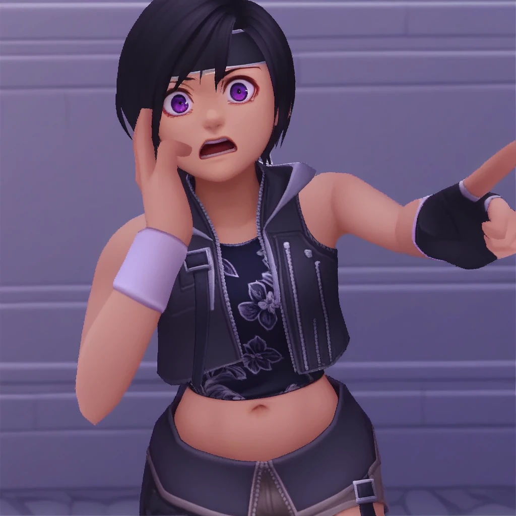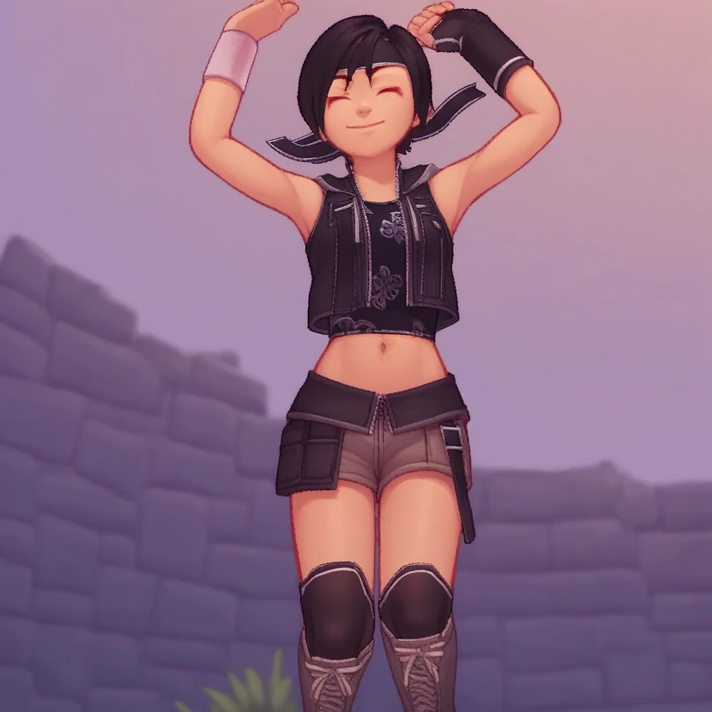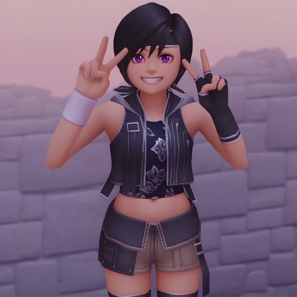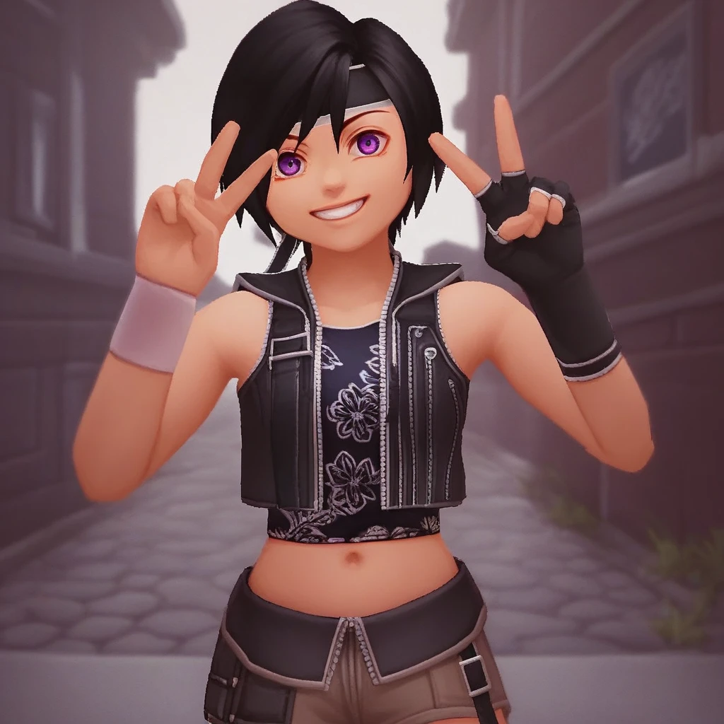 black jacket, sleeveless, black tanktop, floral shirt design, white wristband, black fingerless glove, navel, short shorts, black thighhighs