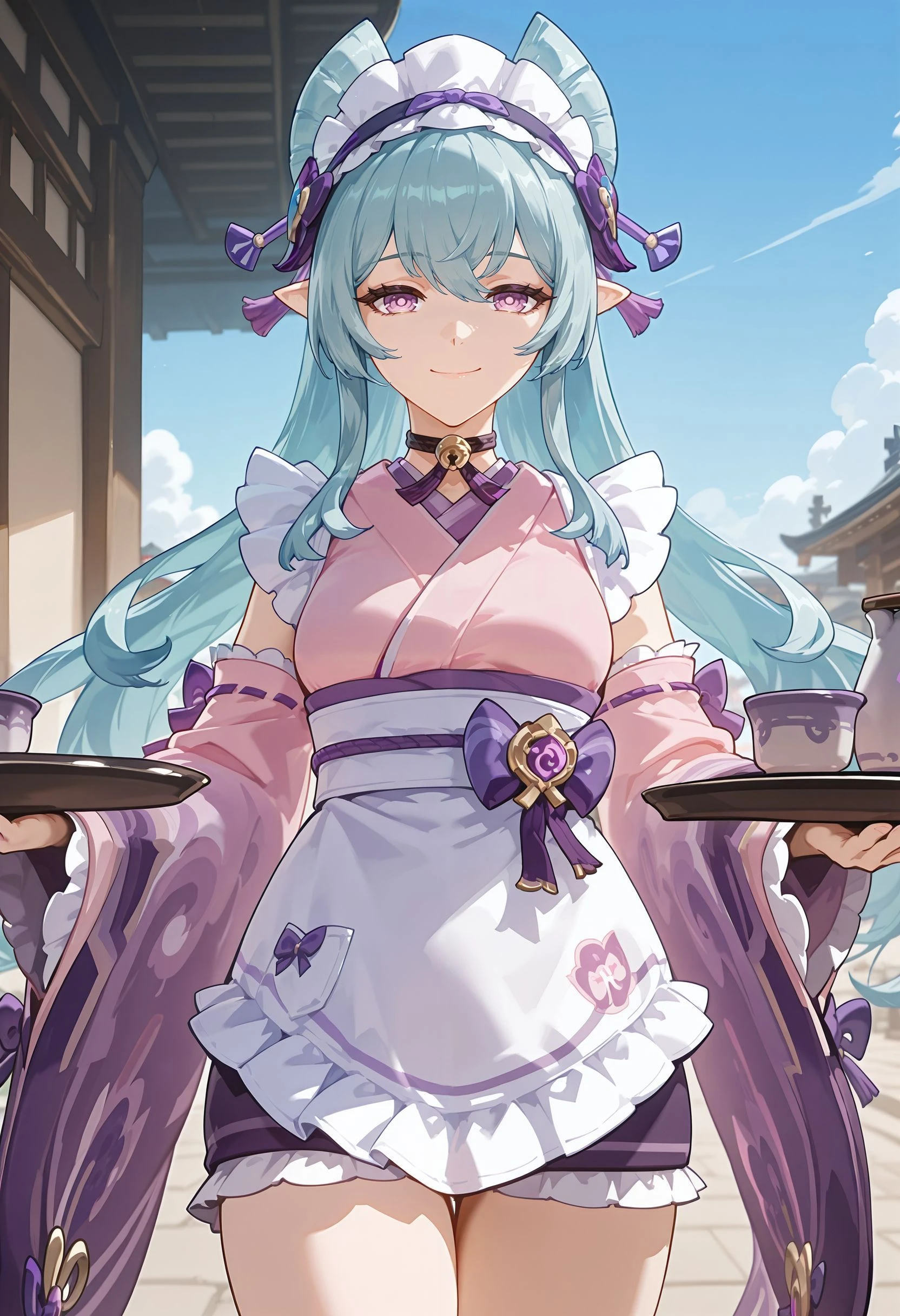 genshin impact, gnshnymmzkmzk, bangs, bell, bow, breasts, detached sleeves, eyebrows visible through hair, jingle bell, kimono, long hair, long sleeves, maid headdress, medium breasts, neck bell, pointy ears, purple bow, purple eyes, green hair, sash, wide sleeves, apron, japanese clothes, kimono, sleeves past wrists, wa maidWithout Clothes