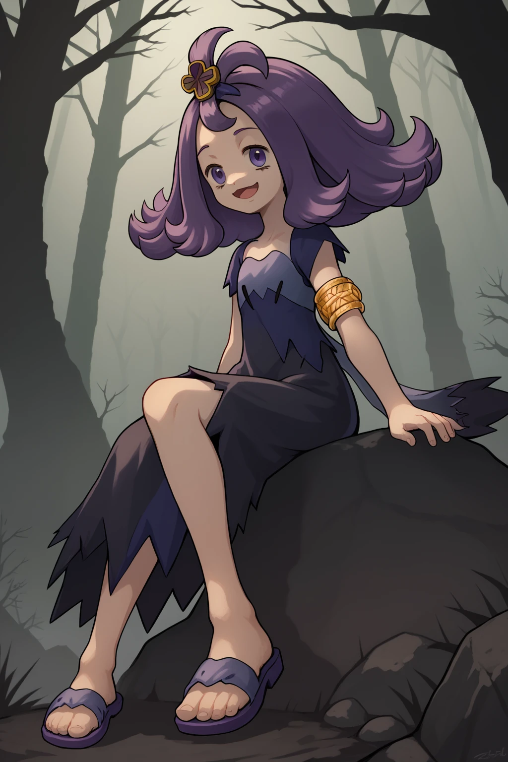 1default1, purple dress, torn dress, hair ornament, gold armlet, smile, short sleeves, open mouth, stitches, purple sandals