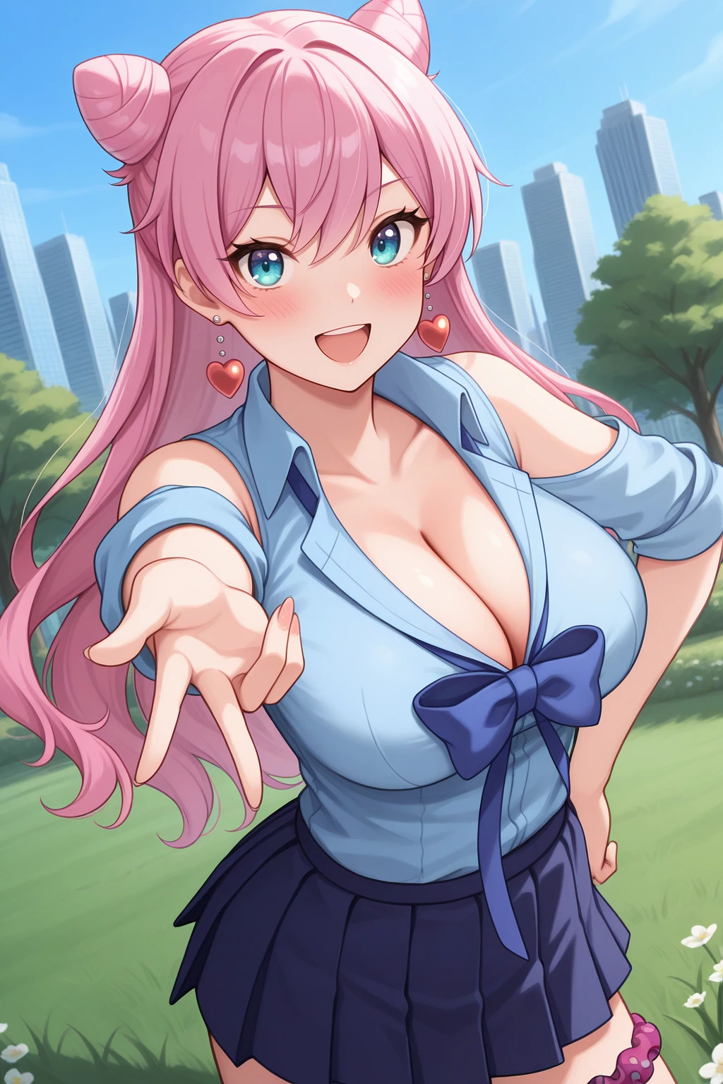wtnb, large breasts, blue eyes, pink hair, hair between eyes, long hair, cone hair bun, double bun, heart earrings