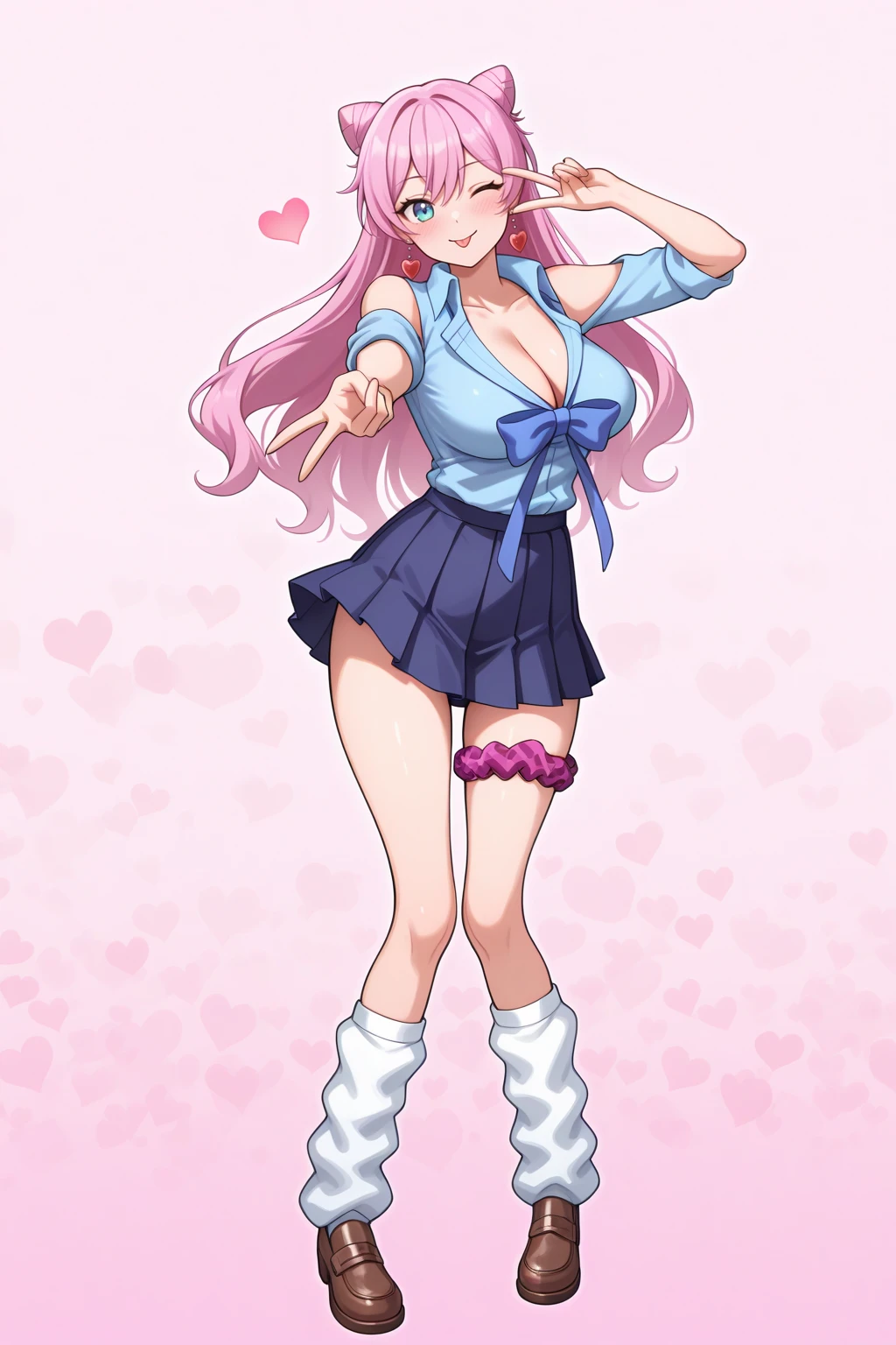 Default Outfit : blue collared shirt, shoulder cutout, cleavage, sleeves rolled up, blue bowtie, blue skirt, pleated skirt, thigh scrunchie, white socks, loose socks, brown footwear