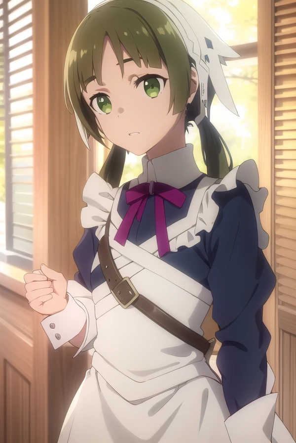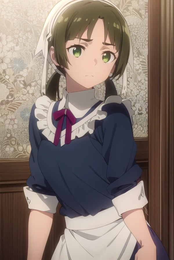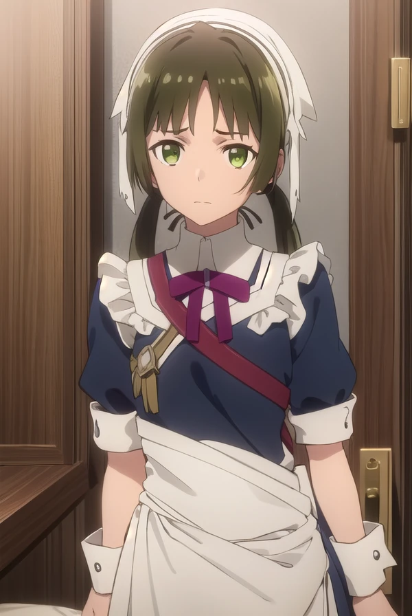 lotte, brown hair, twintails, (green eyes:1.3), low twintails,