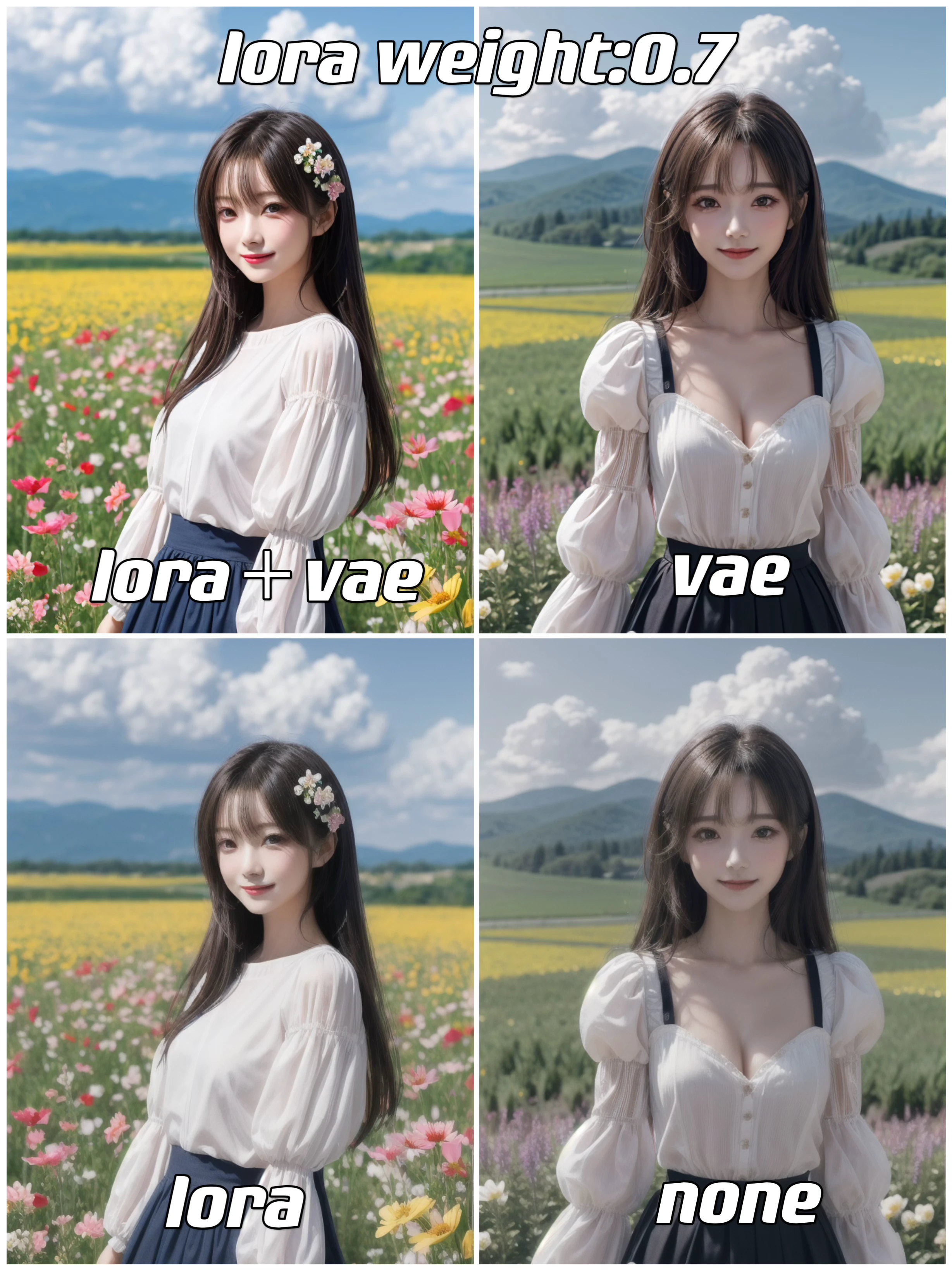 最適な効果を得るためにはVAEを重ねる必要があります。私の使っているVAEは:vae-ft-mse-840000-ema-pruned。他のVAEも使用可能で、色彩にわずかな違いがあります。ぜひ自分で試してみてください。