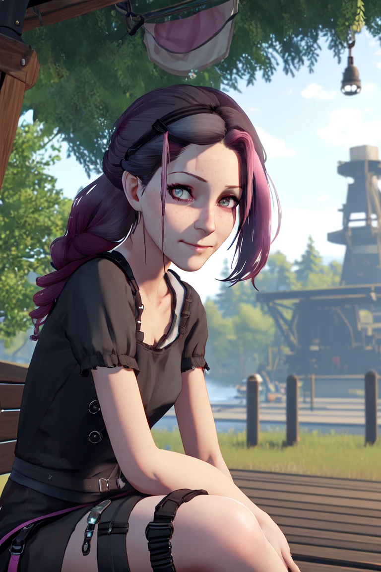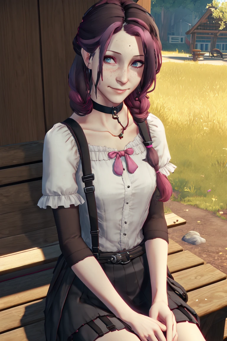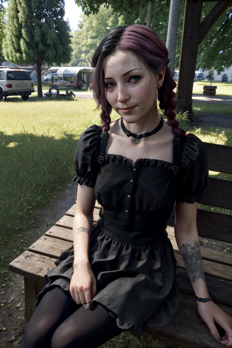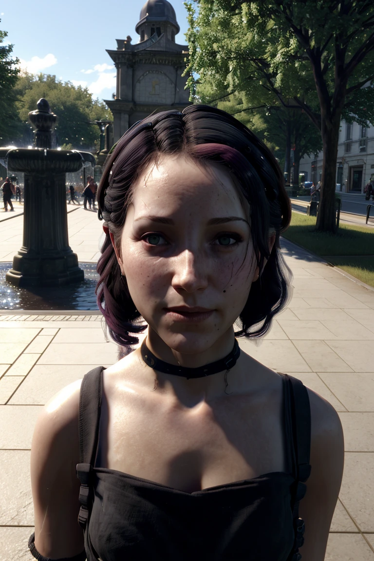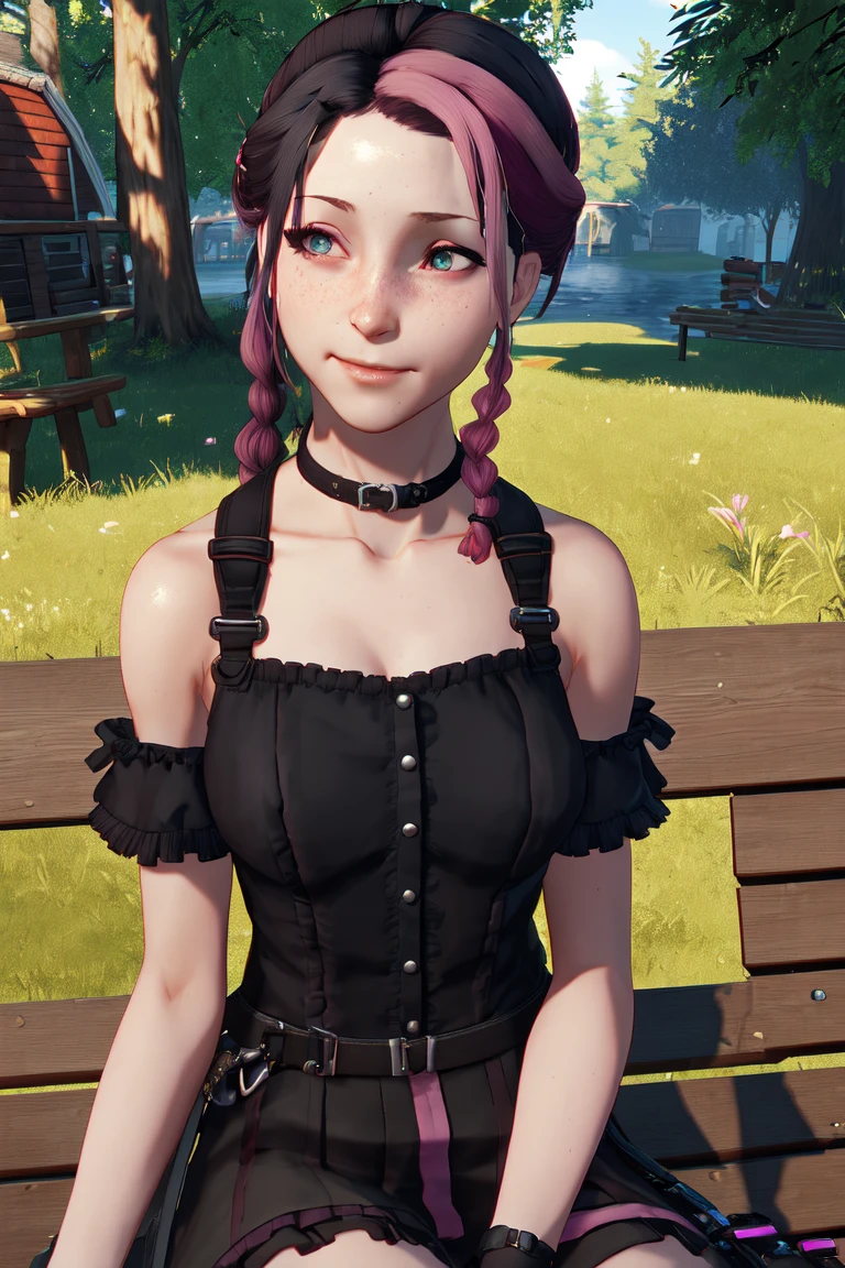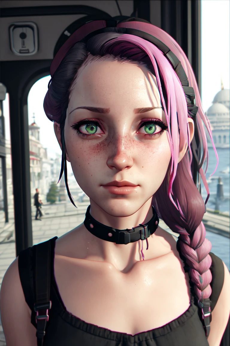 green eyes, black hair, braid, (freckles:0.5), pink hair strand, looking at viewer, choker, black shirt,