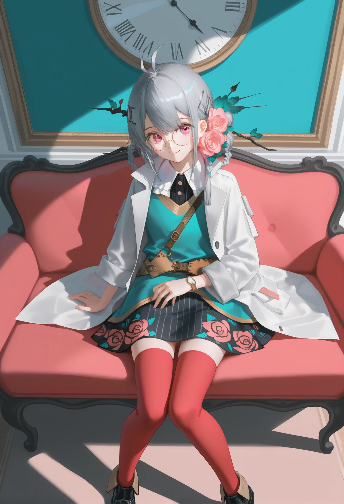 shanshuizhong, grey long hair, braid, antenna hair, hair rings, hairclip, pink eyes, round eyewear, shirt, white open coat, long sleeves, striped skirt, red thighhighs, black footwear, brown belt, watch, hair ornament, hair flower, flower, pink flower, rose, branch, floral print