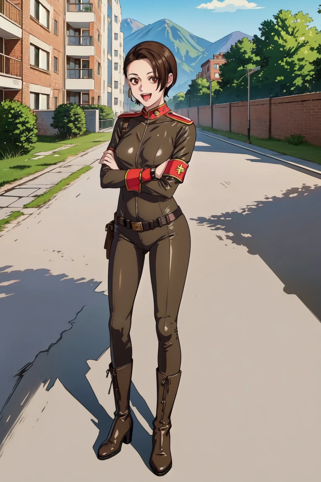 Lt. Zofia from Red Alert 2. Prompt is "RA2Zofia", along with "Short hair,brown/black hair". For her outfit, "military uniform,bodysuit,armband".