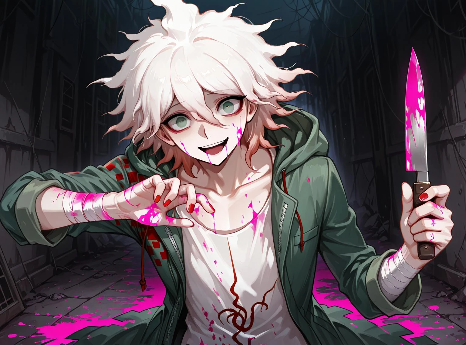 Additional trigger words: pink blood, red nails, crazy eyes, crazy, grin, chain, bandaged arm, hood up