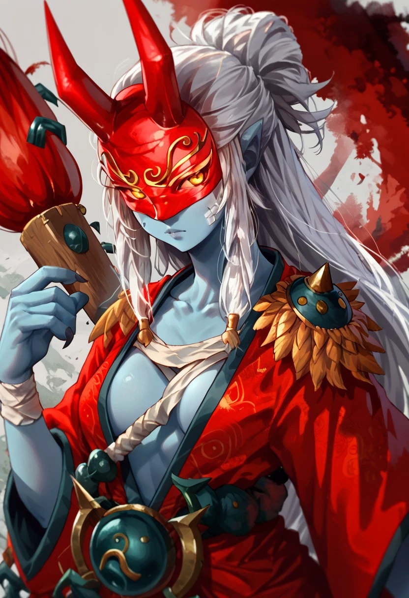 Grimstroke, red mask, white hair, blue skin, golden eyes