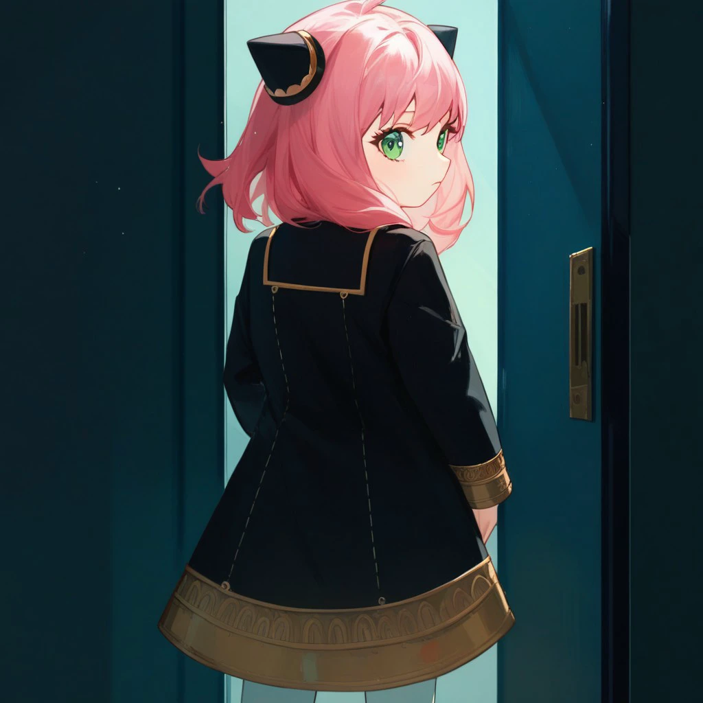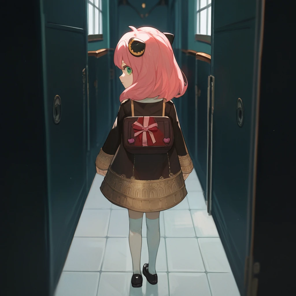 eden academy school uniform, dress, red ascot, gold trim, long sleeves, white thighhighs, black footwear,