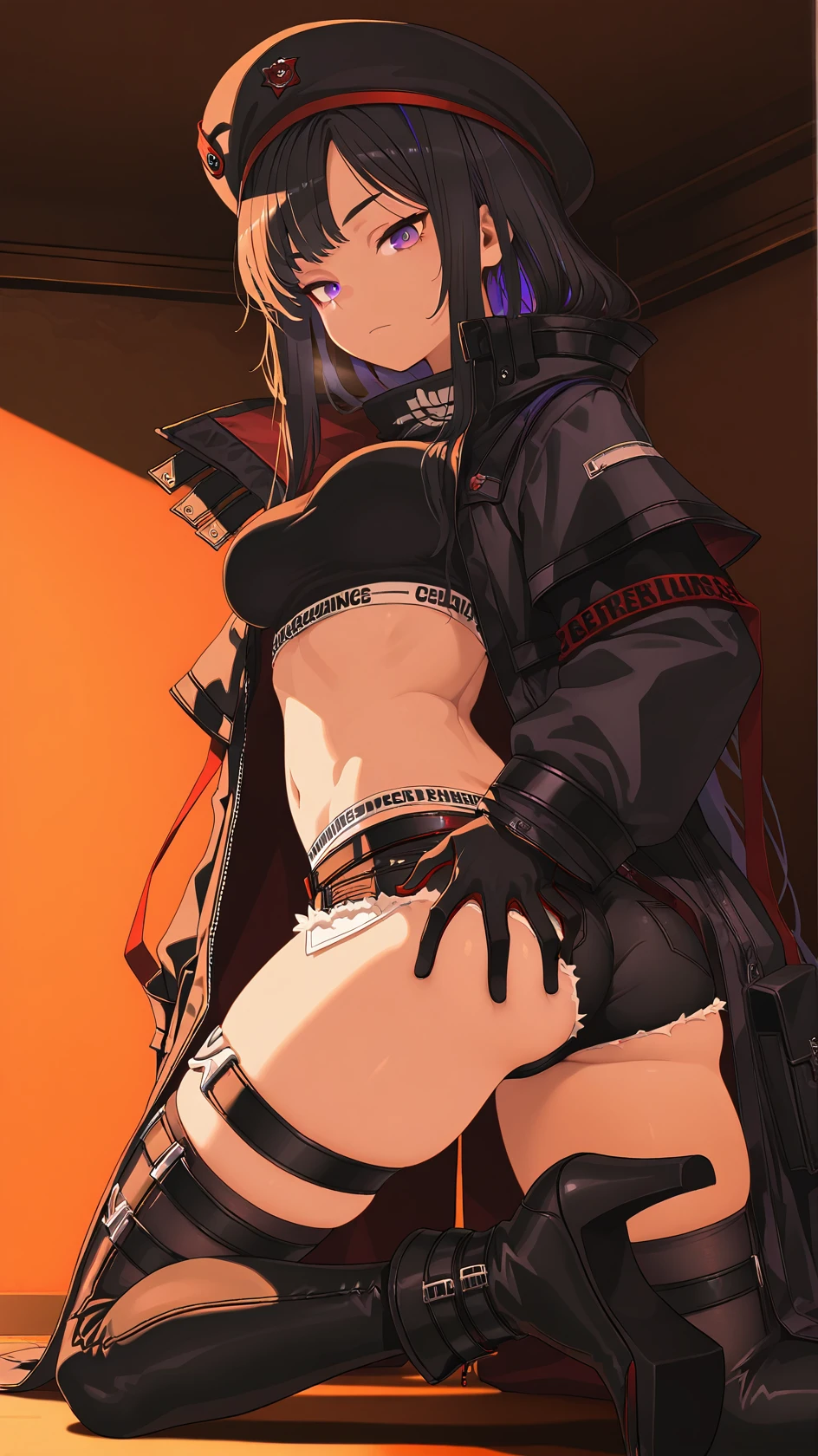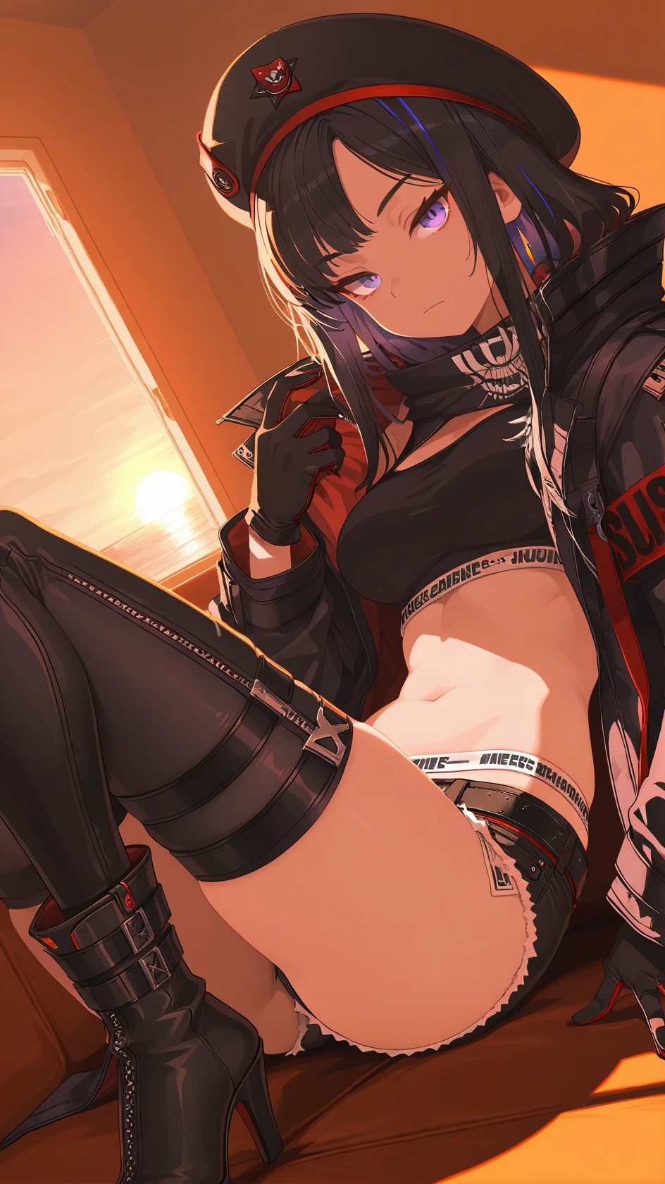 Example prompt : long hair, bangs, blue eyes, shirt, black hair, thighhighs, gloves, long sleeves, hat, navel, purple eyes, jacket, thighs, multicolored hair, boots, open clothes, shorts, midriff, belt, black thighhighs, stomach, bag, black footwear, high heels, open jacket, streaked hair, black jacket, crop top, short shorts, black headwear, skindentation, thigh strap, beret, black shorts, red gloves, high heel boots, black coat, micro shorts, , two-tone gloves,