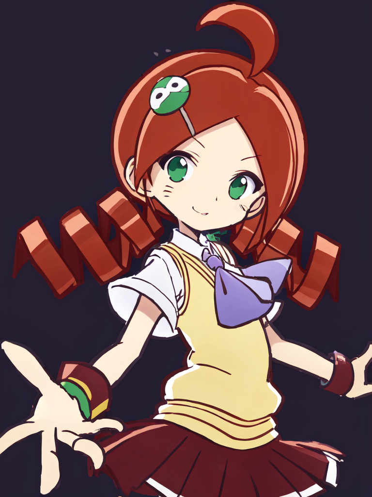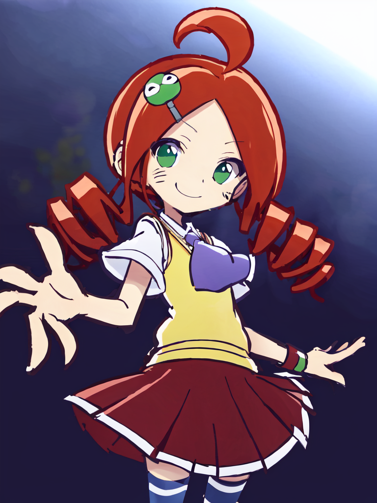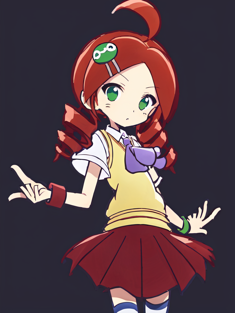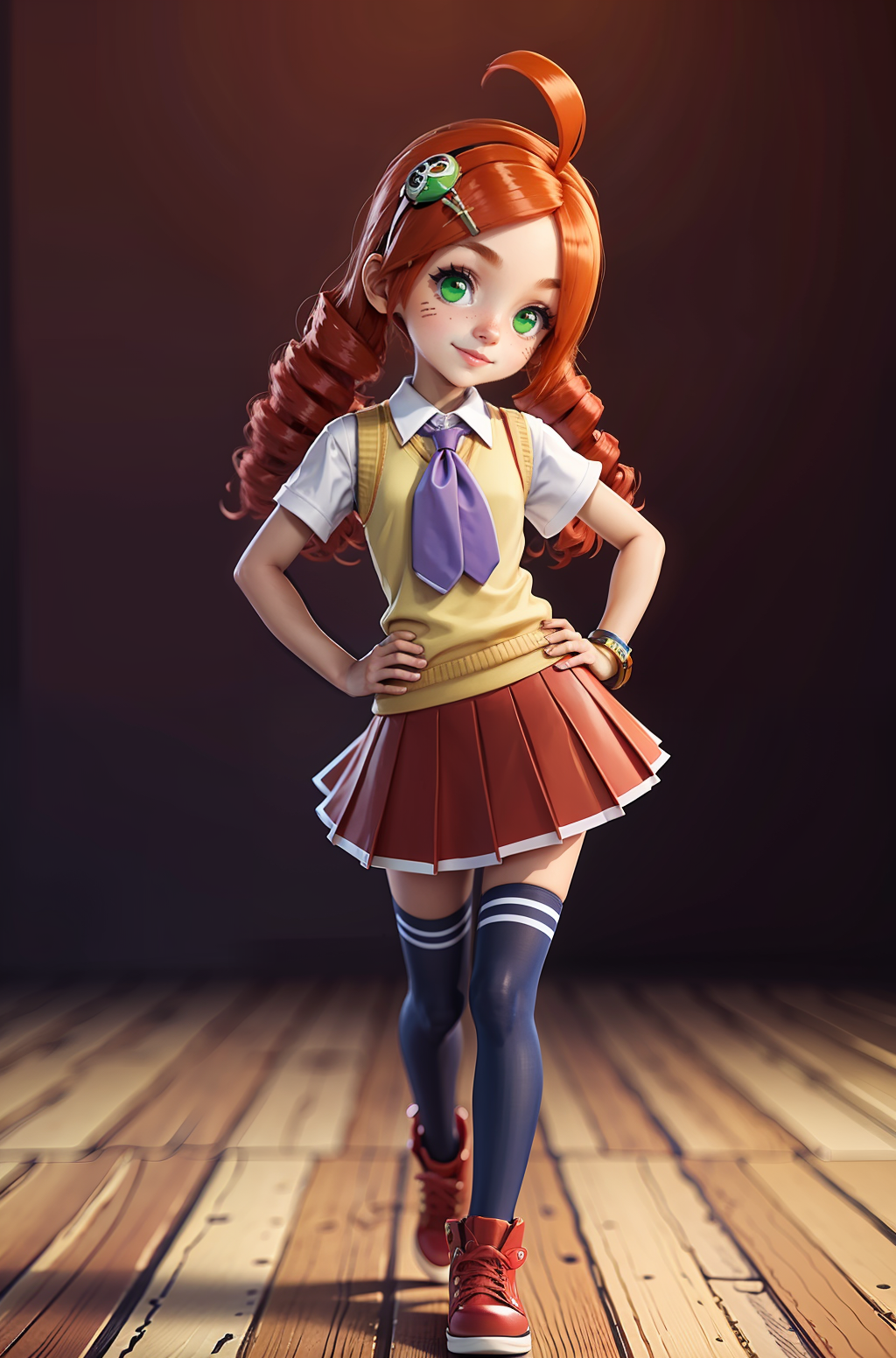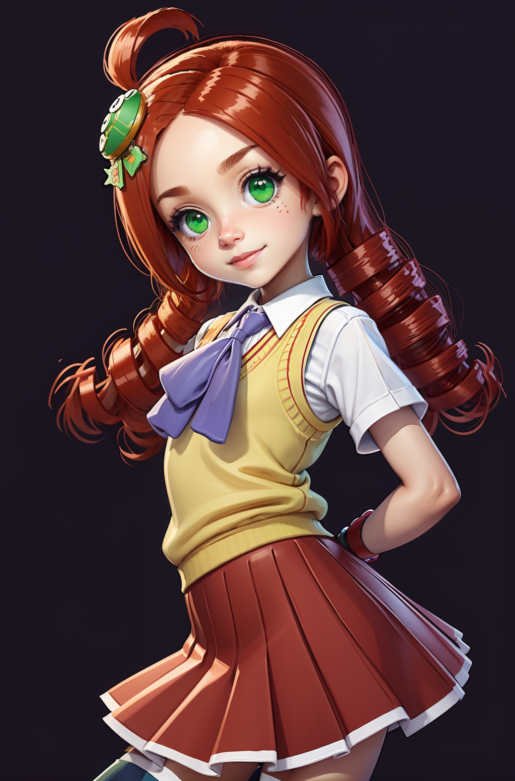 <lora:ringo:0.7> kawaii ringo petite cute 1girl, green eyes, character hair ornament, red hair, ahoge, twin drill, wristband white skirt, cleamyellow sweater vest, red skirt, purple necktie, school uniform, navyblue thighhighs, red shoes, zettai ryouiki kind smile