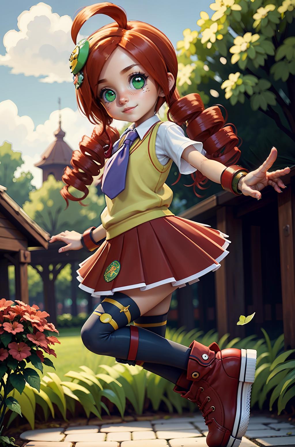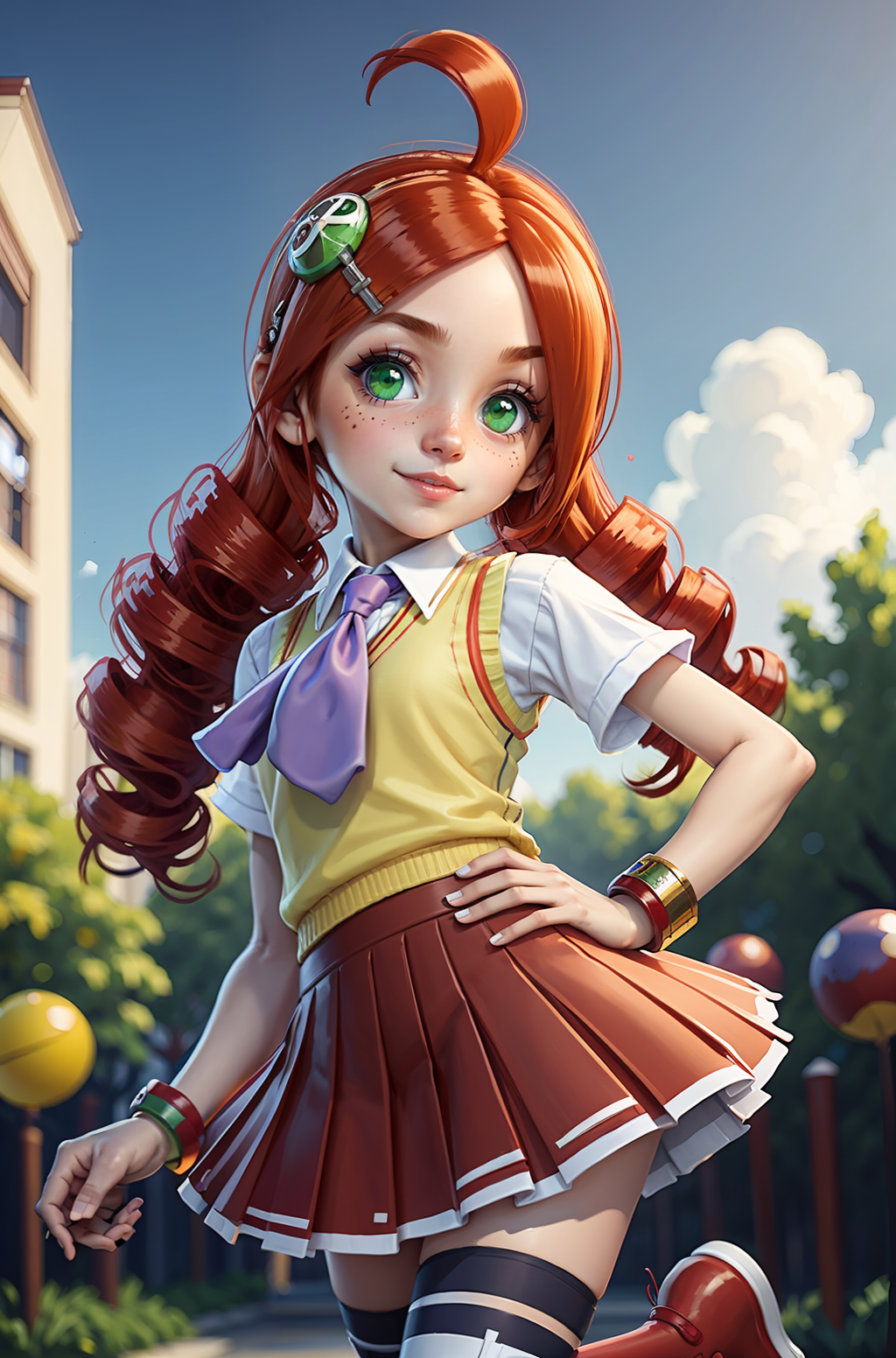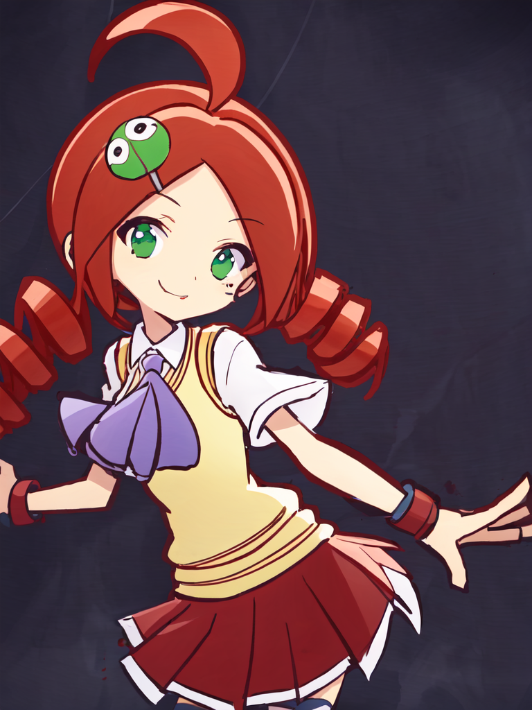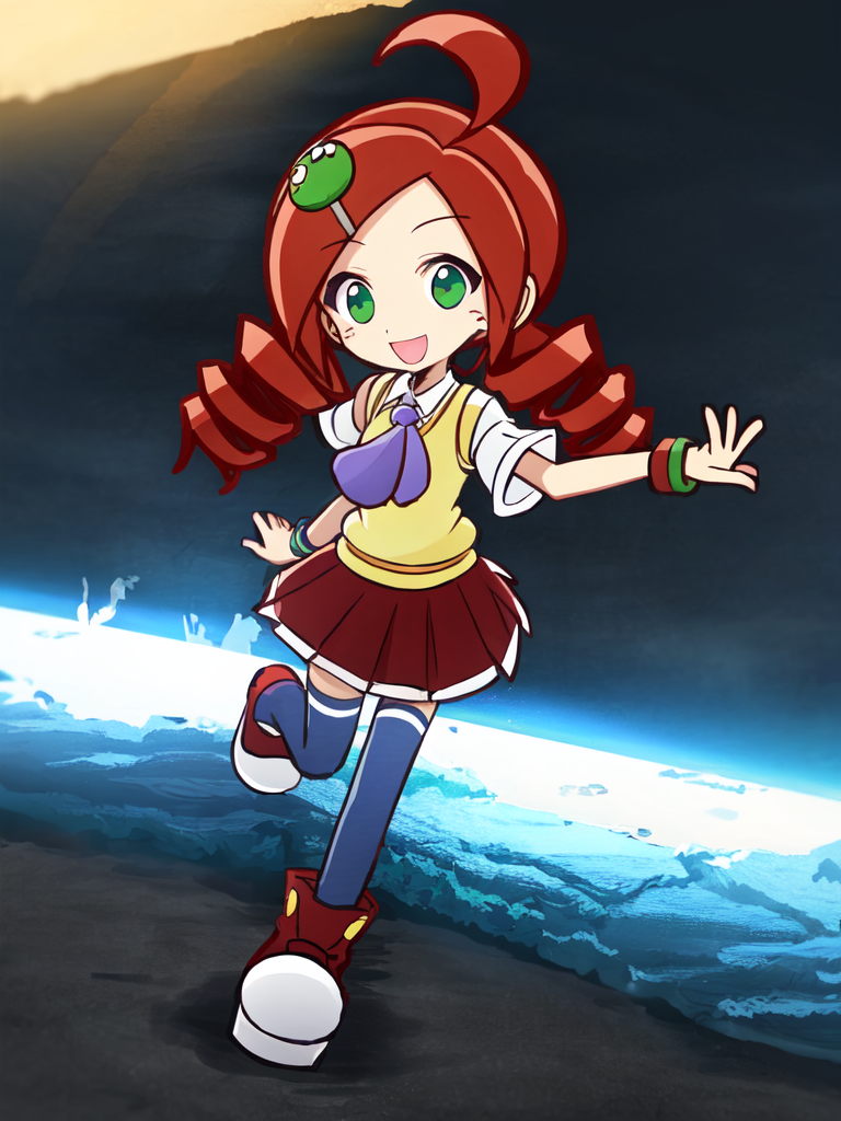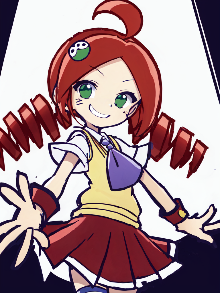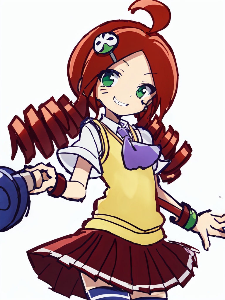 <lora:ringo:0.7> kawaii ringo petite cute 1girl, green eyes, character hair ornament, red hair, ahoge, twin drill, wristband white skirt, cleamyellow sweater vest, red skirt, purple necktie, school uniform, navyblue thighhighs, red shoes, zettai ryouiki kind smile