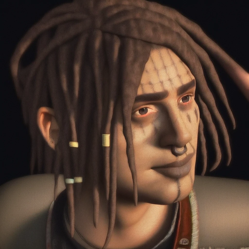 nose piercing, jewelry, 1boy, bangs, dreadlocks, facial tattoo,