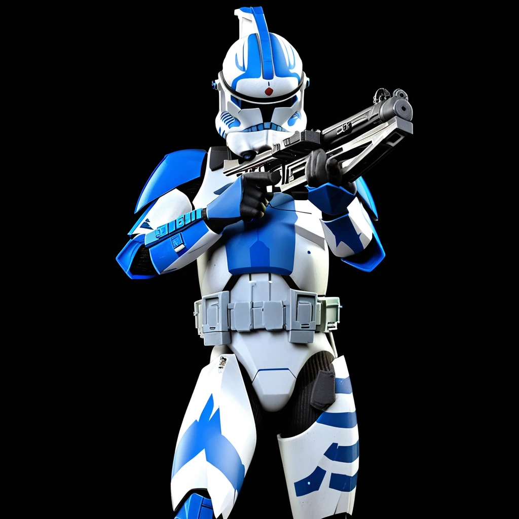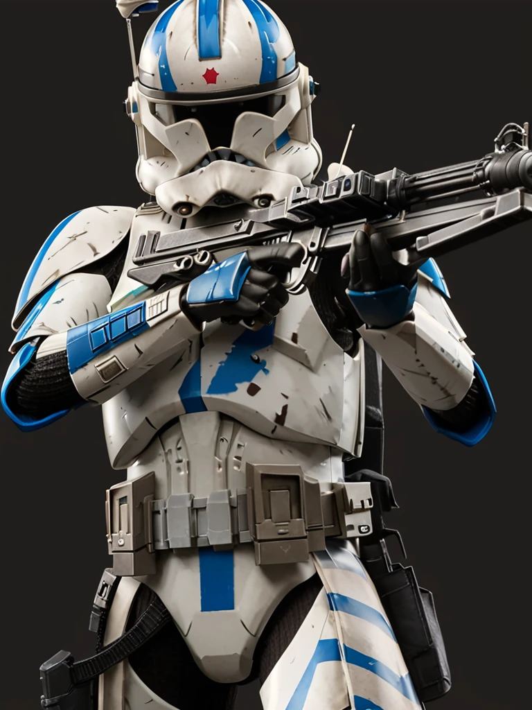 Star Wars Clone Troopers trained on about 15 images, obtained from high quality 3D models, some collectible toys, and a few movie stills, plus including the real life face of Commander Cody. Contains the most popular armor marking colors orange and blue. Trained on weapons from the Clone Wars, so plenty of good guns and blasters are a part of the reference, so many look star wars accurate.