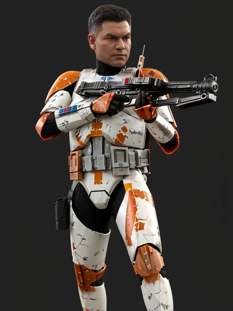 (upper body1.5) shot Star Wars Clone Trooper <lora:CloneTrooper-Prequels:0.8> with orange paint markings holding and aiming a gun, 1boy, weapon, male focus, gun, solo, realistic, helmet removed, rifle, armor, insanely detailed, lifelike, looking at camera, atmospheric, intricate, character photography, 8k, sharp focus, unreal engine 5, volumetric lighting, octane render, vray, character photography, Fujifilm XT3, DSLR, 50mm, ultra-realistic, hyperrealism, authentic star wars atmosphere, masterpiece, trending on artstation