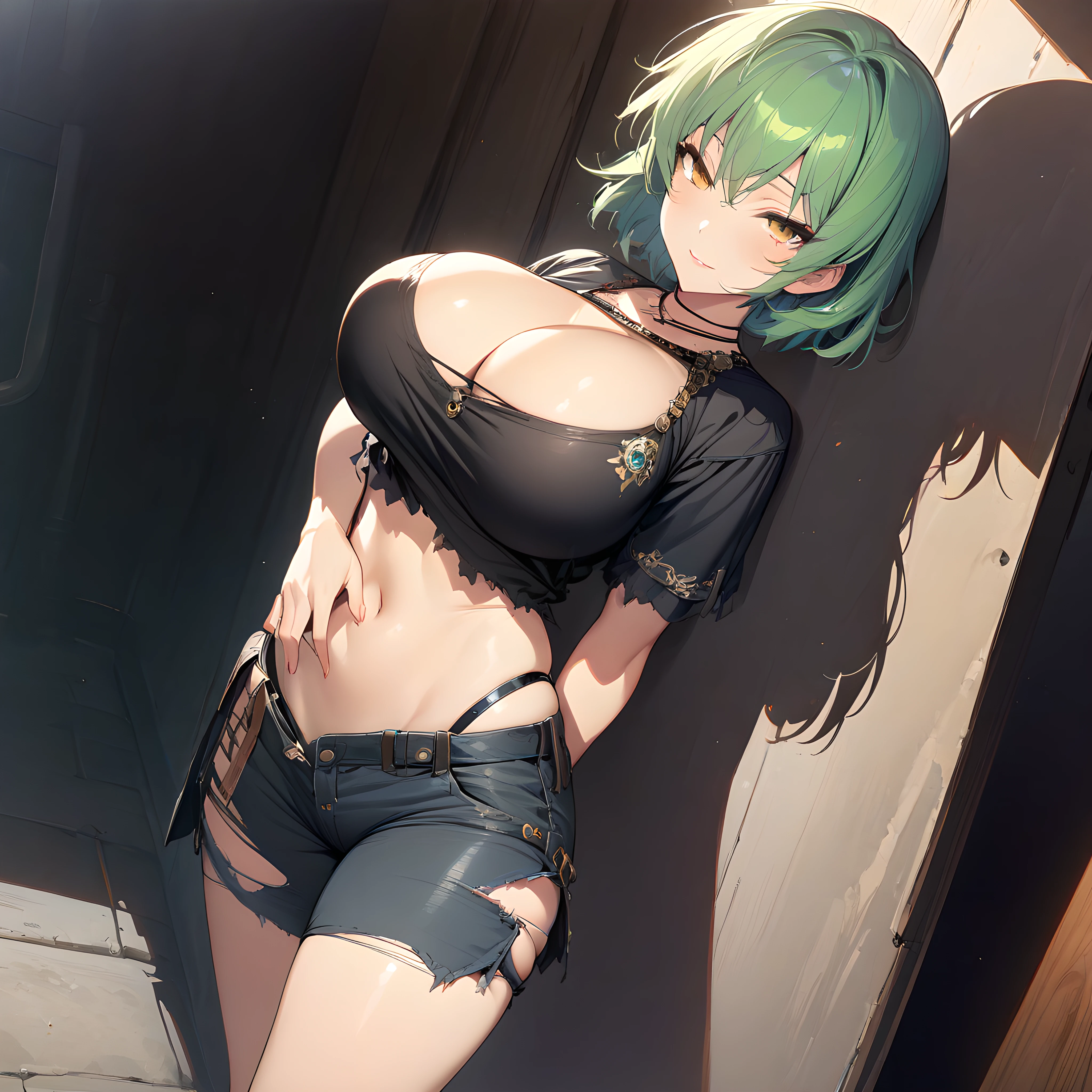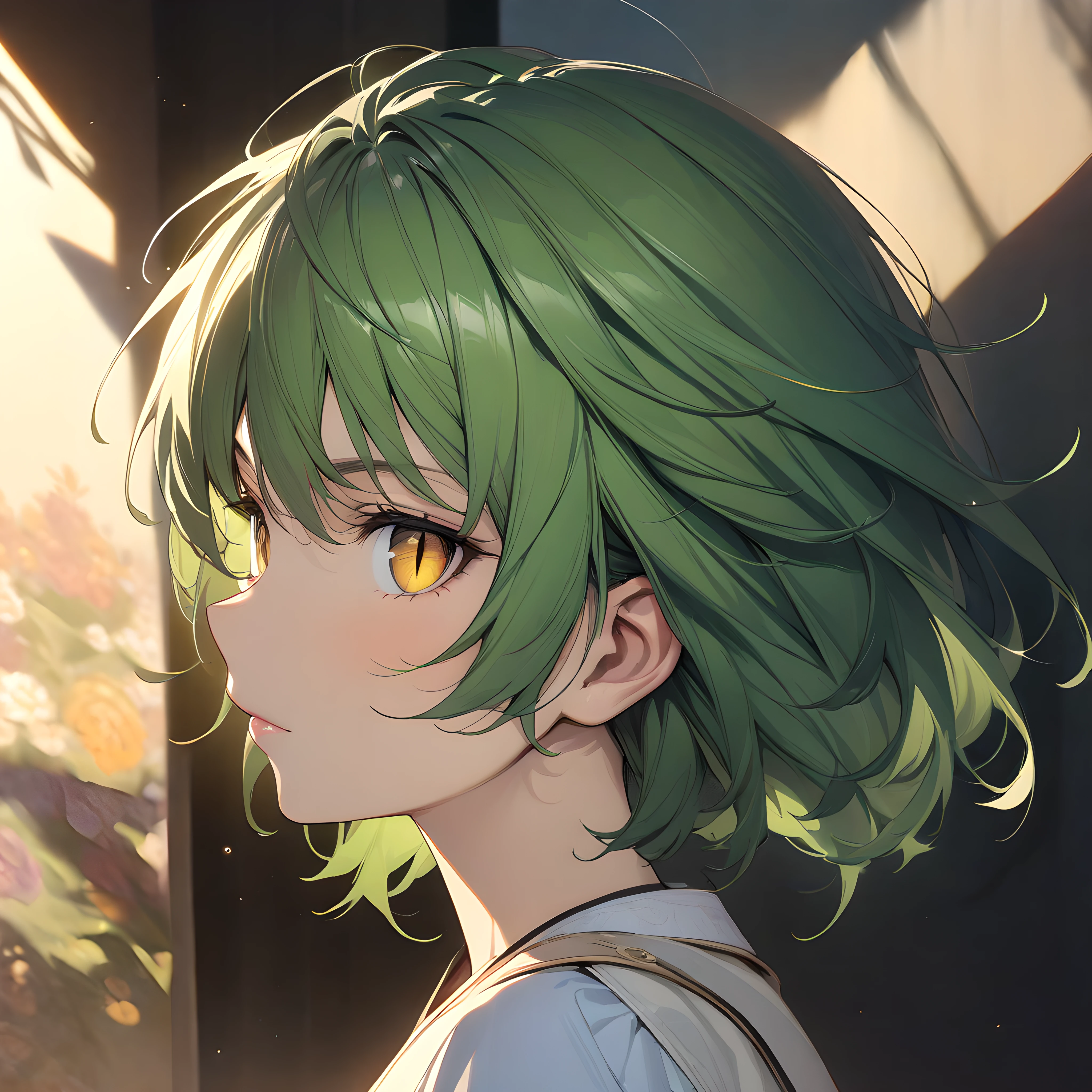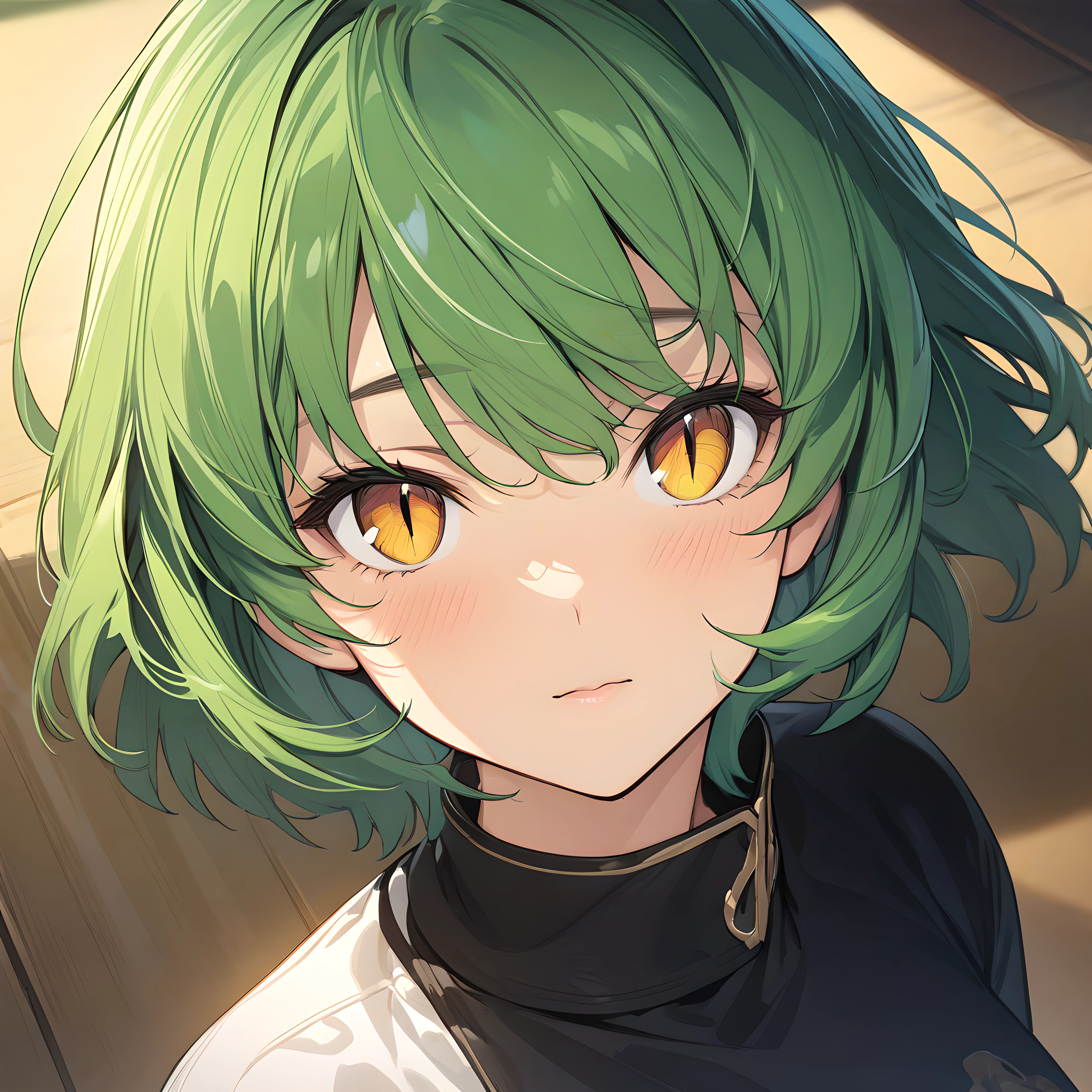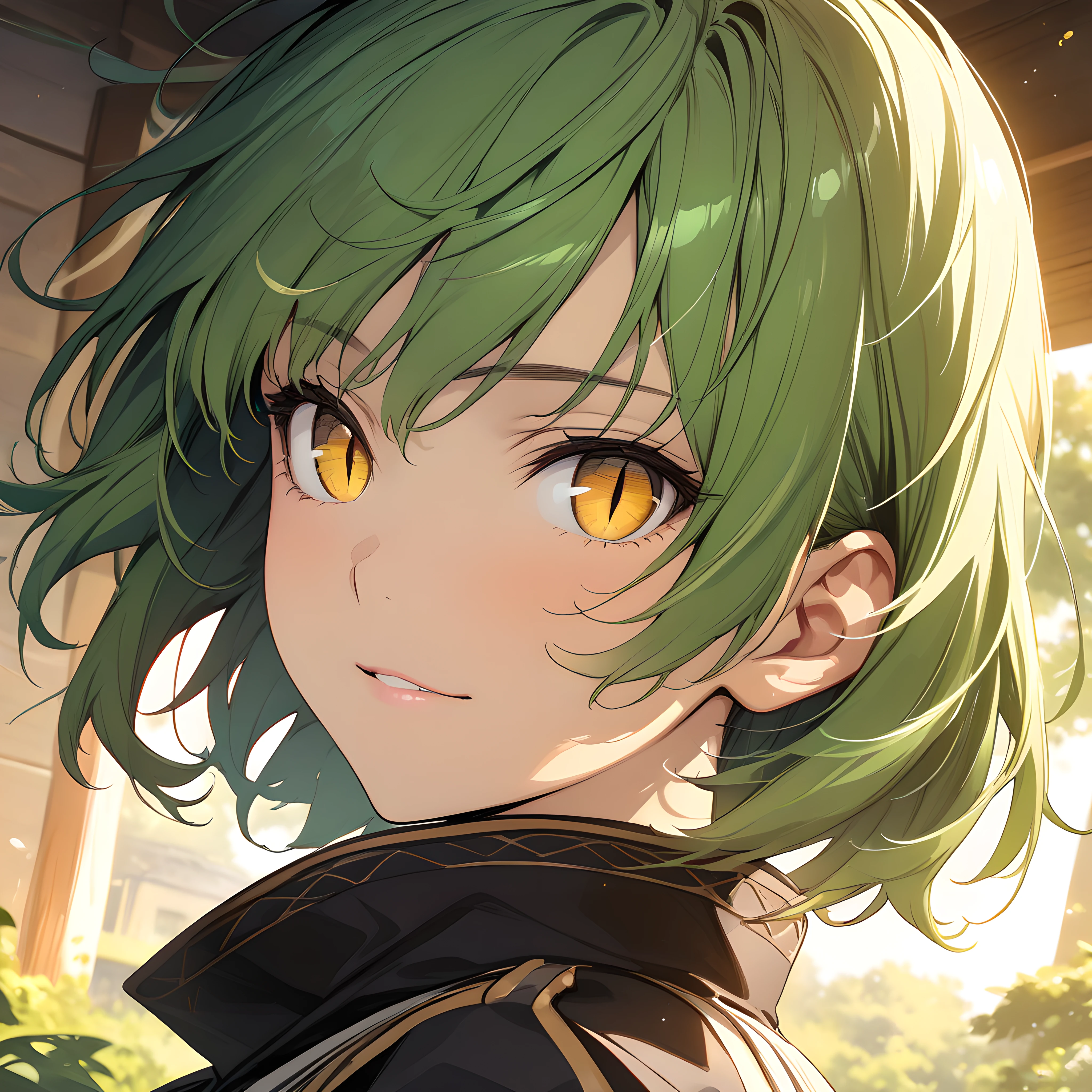 activation tag is "hikage(senrankagura)", appearance tag is "hikage(senrankagura), green hair, yellow eyes, short hair, slit pupils"