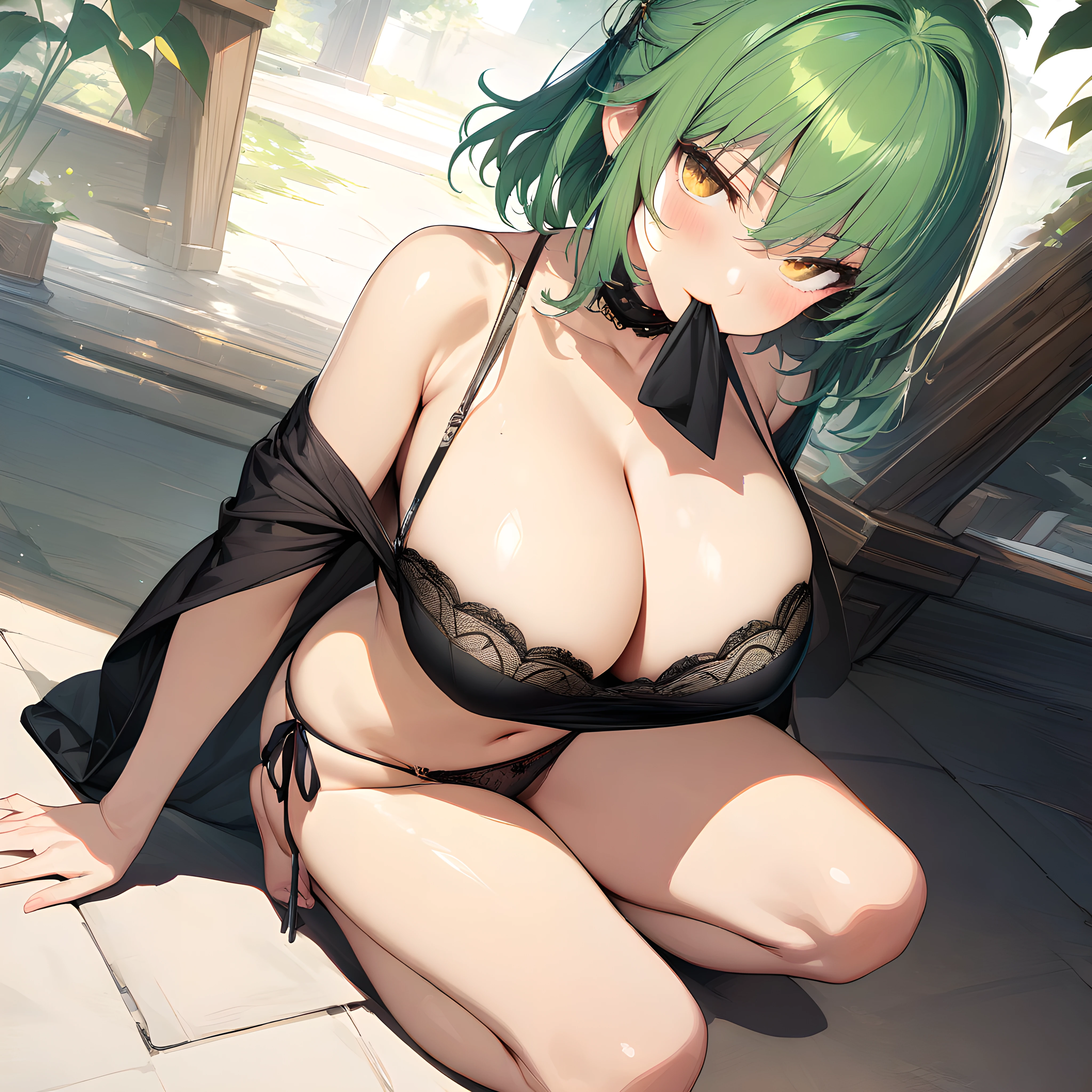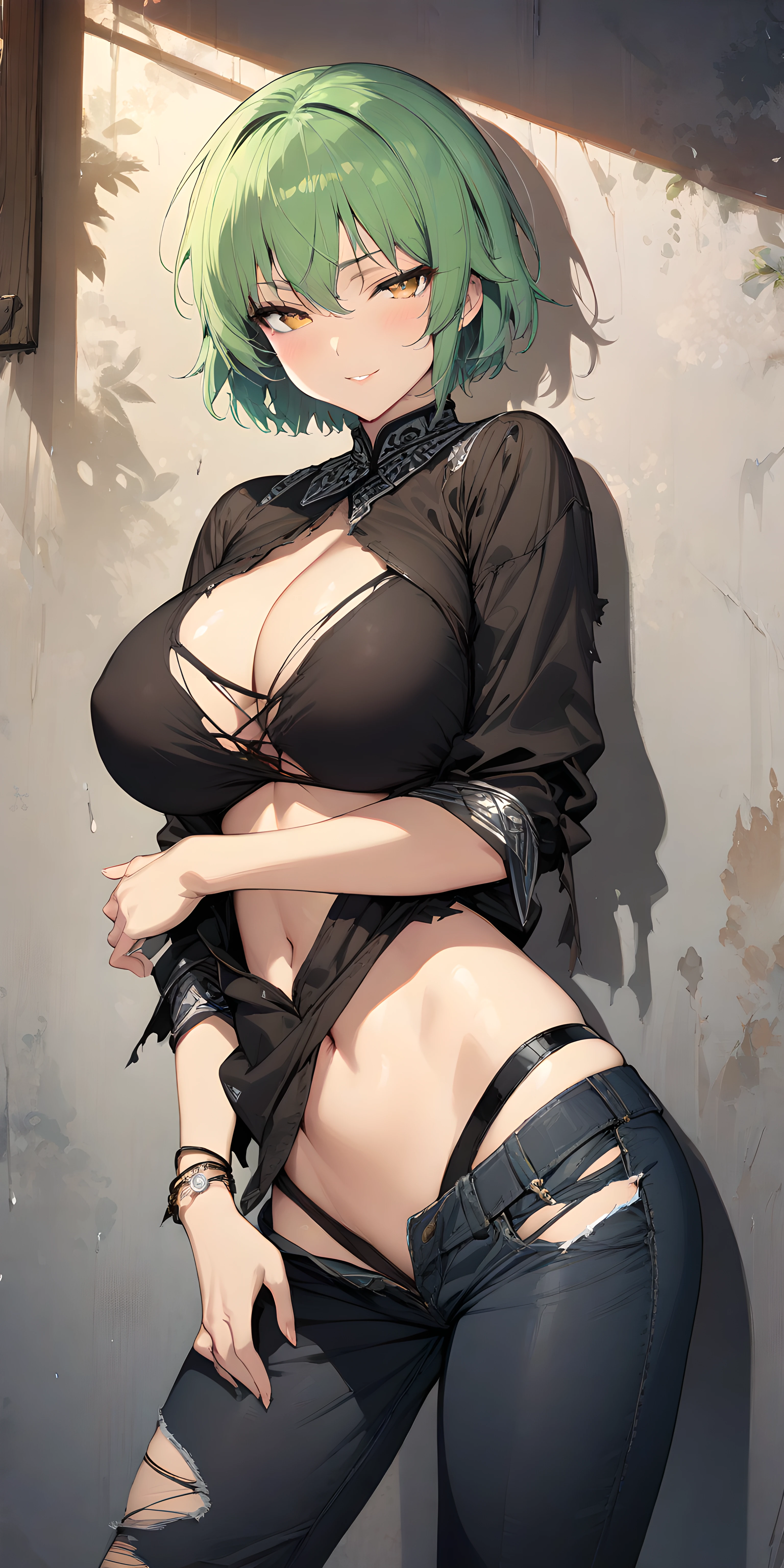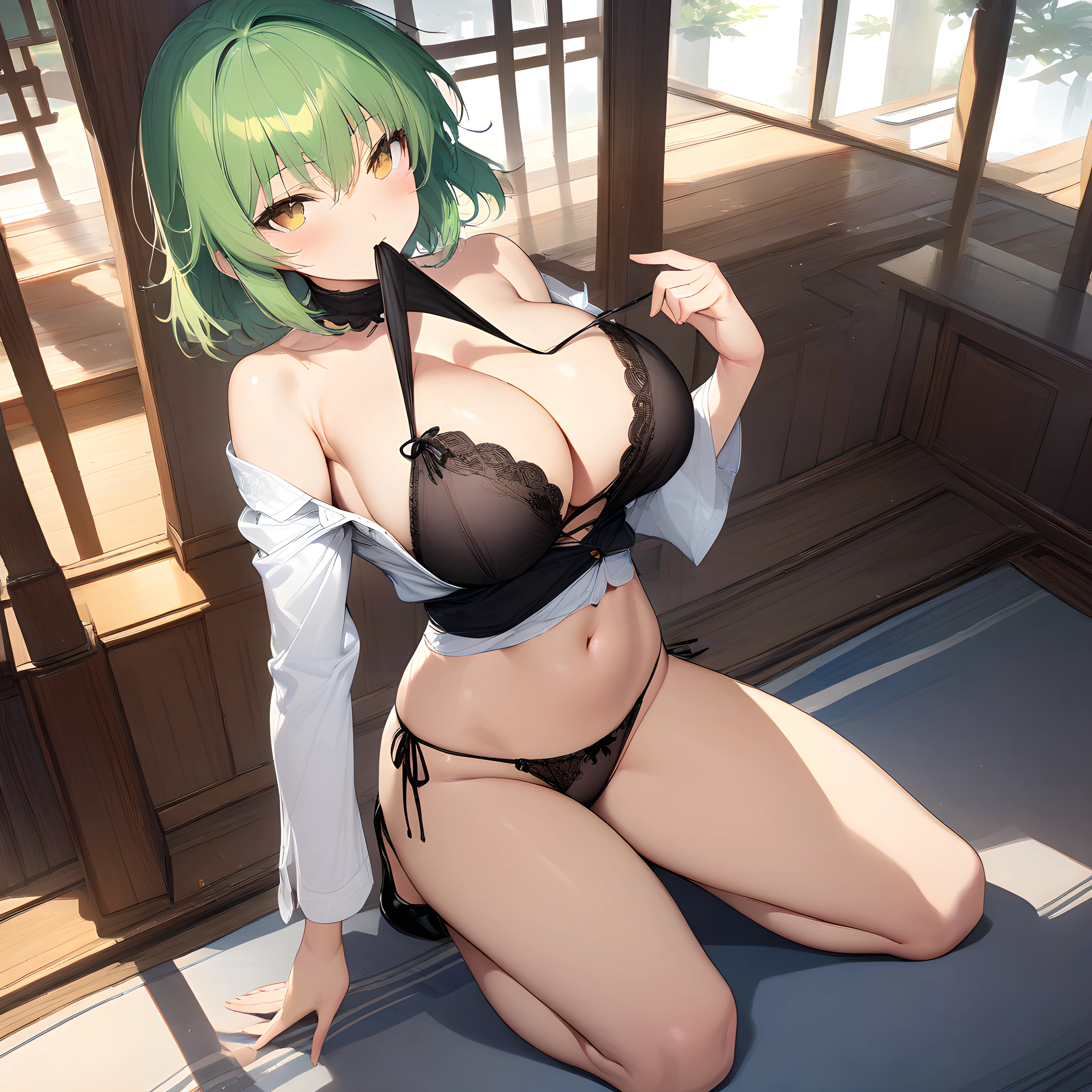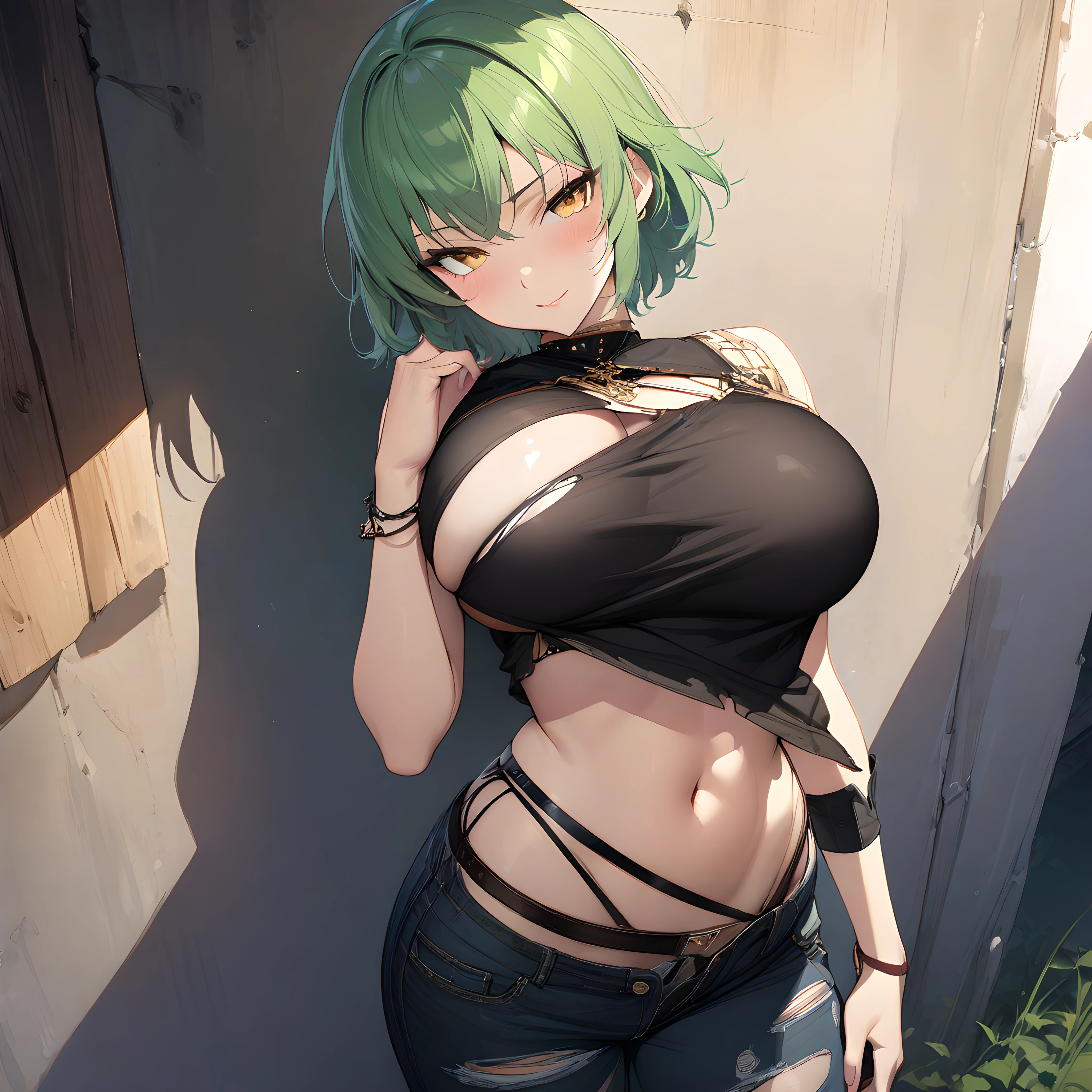 activation tag is "hikage(senrankagura)", appearance tag is "hikage(senrankagura), green hair, yellow eyes, short hair, slit pupils"